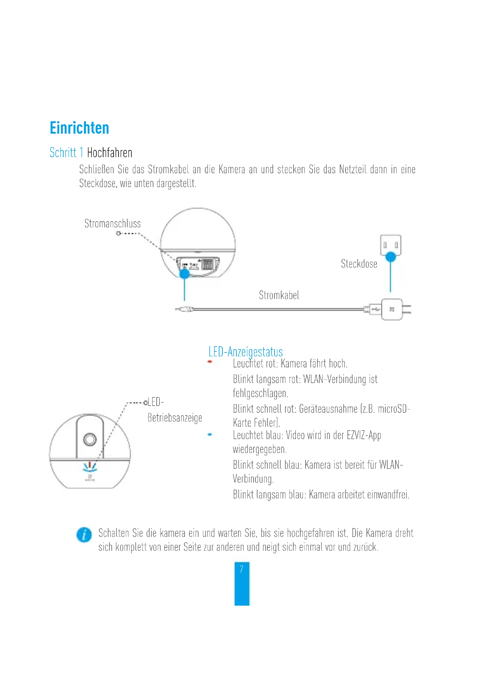 network, it will automatically connect to the same Wi-Fi network. Solid Wall Wooden Wall6 Appendix Box Content Camera (x1) Base (x1) Power Cable (x1) Drill Template (x1) Screw Kit (x1) Power Adapter (x1) Quick Start Guide x(1)7 Einrichten Schritt 1 Hochfahren Schließen Sie das Stromkabel an die Kamera an und stecken Sie das Netzteil dann in eine Steckdose, wie unten dargestellt. Steckdose Stromanschluss Stromkabel LED-Anzeigestatus Leuchtet rot: Kamera fährt hoch. Blinkt langsam rot: WLAN-Verbindung ist fehlgeschlagen. Blinkt schnell rot: Geräteausnahme (z.B. microSD- Karte Fehler). Leuchtet blau: Video wird in der EZVIZ-App wiedergegeben. Blinkt schnell blau: Kamera ist bereit für WLAN- Verbindung. Blinkt langsam blau: Kamera arbeitet einwandfrei. LED- Betriebsanzeige Schalten Sie die kamera ein und warten Sie, bis sie hochgefahren ist. Die Kamera dreht sich komplett von einer Seite zur anderen und neigt sich einmal vor und zurück.8 Schritt 2 Kamera einrichten