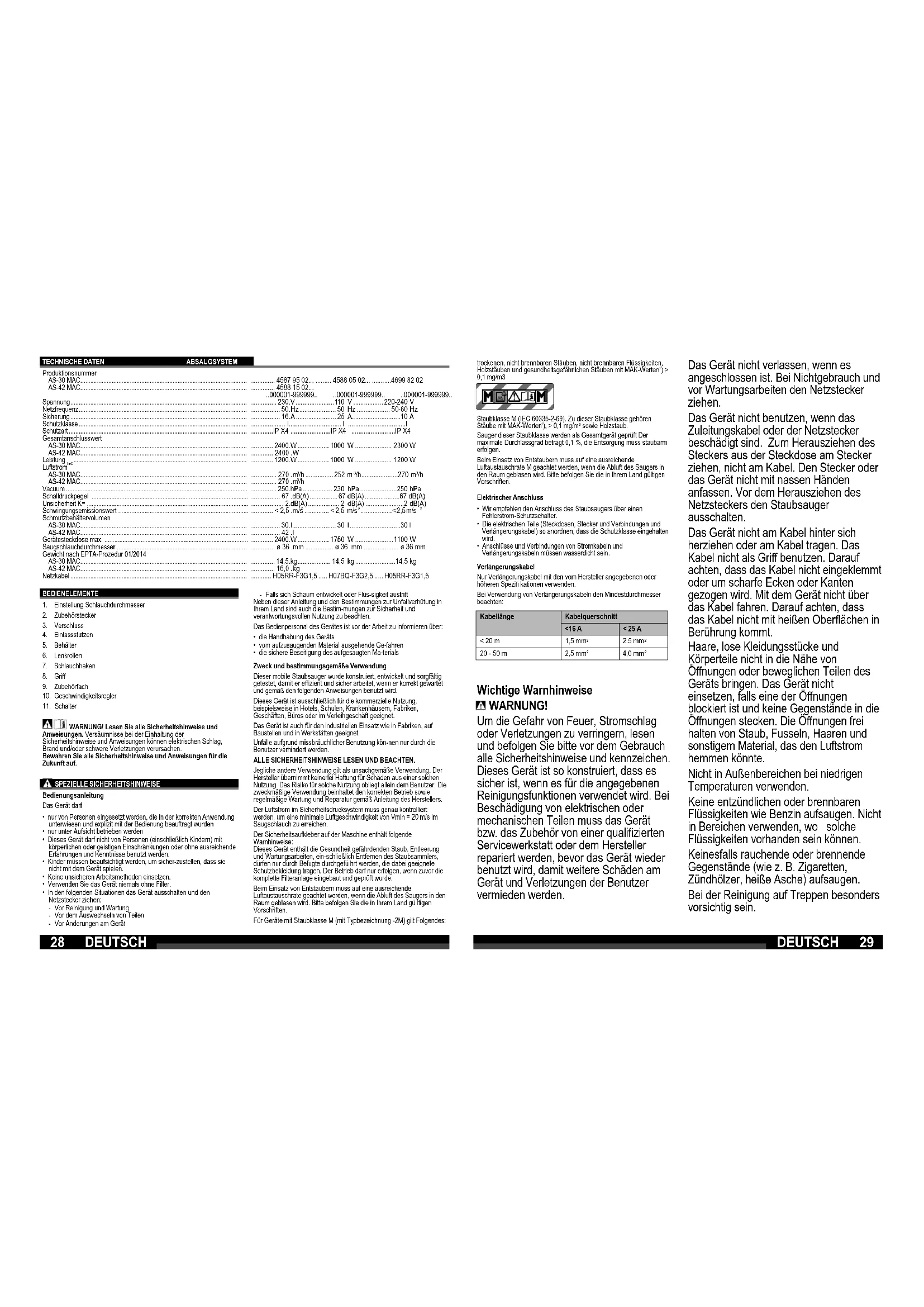 - die sichere Beseitigung des aufgesaugten Ma-terials Zweck und bestimmungsgemäße Verwendung Dieser mobile Staubsauger wurde konstruiert, entwickelt und sorgfältig getestet, damit er effi zient und sicher arbeitet, wenn er korrekt gewartet und gemäß den folgenden Anweisungen benutzt wird. Dieses Gerät ist ausschließlich für die kommerzielle Nutzung, beispielsweise in Hotels, Schulen, Krankenhäusern, Fabriken, Geschäften, Büros oder im Verleihgeschäft geeignet. Das Gerät ist auch für den industriellen Einsatz wie in Fabriken, auf Baustellen und in Werkstätten geeignet. Unfälle aufgrund missbräuchlicher Benutzung kön-nen nur durch die Benutzer verhindert werden. ALLE SICHERHEITSHINWEISE LESEN UND BEACHTEN. Jegliche andere Verwendung gilt als unsachgemäße Verwendung. Der Hersteller übernimmt keinerlei Haftung für Schäden aus einer solchen Nutzung. Das Risiko für solche Nutzung obliegt allein dem Benutzer. Die zweckmäßige Verwendung beinhaltet den korrekten Betrieb sowie regelmäßige Wartung und Reparatur gemäß Anleitung des Herstellers. Der Luftstrom im Sicherheitsdrucksystem muss genau kontrolliert werden, um eine minimale Luftgeschwindigkeit von Vmin = 20 m/s im Saugschlauch zu erreichen. Der Sicherheitsaufkleber auf der Maschine enthält folgende Warnhinweise: Dieses Gerät enthält die Gesundheit gefährdenden Staub. Entleerung und Wartungsarbeiten, ein-schließlich Entfernen des Staubsammlers, dürfen nur durch Befugte durchgefü hrt werden, die dabei geeignete Schutzbekleidung tragen. Der Betrieb darf nur erfolgen, wenn zuvor die komplette Filteranlage eingebaut und geprüft wurde. Beim Einsatz von Entstaubern muss auf eine ausreichende Luftaustauschrate geachtet werden, wenn die Abluft des Saugers in den Raum geblasen wird. Bitte befolgen Sie die in Ihrem Land gü ltigen Vorschriften. Für Geräte mit Staubklasse M (mit Typbezeichnung -2M) gilt Folgendes: trockenen, nicht brennbaren Stäuben, nicht brennbaren Flüssigkeiten, Holzstäuben und gesundheitsgefährlichen Stäuben mit MAK-Werten