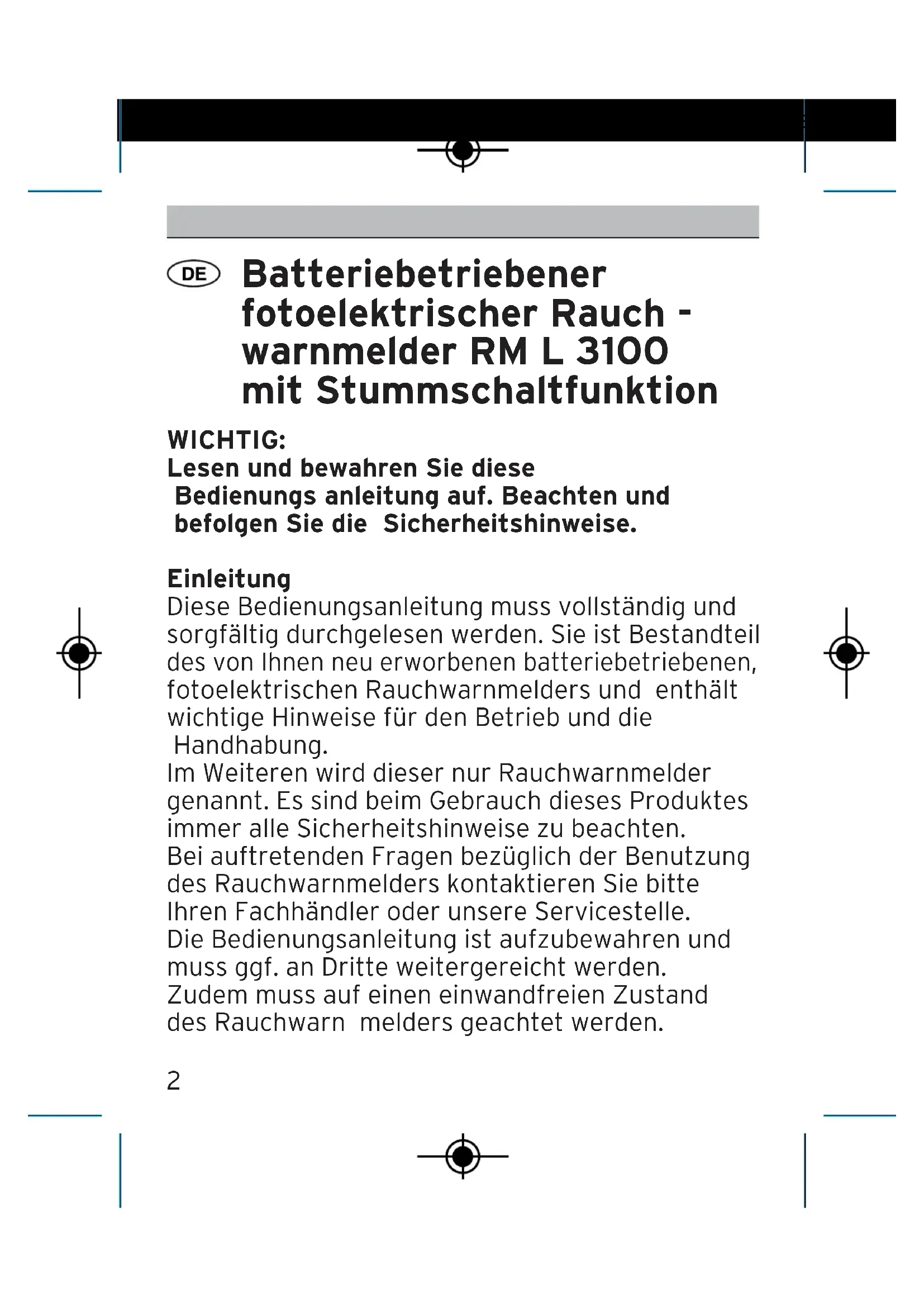 - Manual de instrucciones Rauchwarnmelder Smoke Detector RM L 3100 086215 Rauchwarnmelder RM L 3100.qxp_086215 BA_RauchwarBatteriebetriebener fotoelektrischer Rauch - warnmelder RM L 3100 mit Stummschaltfunktion WICHTIG: Lesen und bewahren Sie diese Bedienungs anleitung auf. Beachten und befolgen Sie die Sicherheitshinweise. Einleitung Diese Bedienungsanleitung muss vollständig und sorgfältig durchgelesen werden. Sie ist Bestandteil des von Ihnen neu erworbenen batteriebetriebenen, fotoelektrischen Rauchwarnmelders und enthält wichtige Hinweise für den Betrieb und die Handhabung. Im Weiteren wird dieser nur Rauchwarnmelder genannt. Es sind beim Gebrauch dieses Produktes immer alle Sicherheitshinweise zu beachten. Bei auftretenden Fragen bezüglich der Benutzung des Rauchwarnmelders kontaktieren Sie bitte Ihren Fachhändler oder unsere Servicestelle. Die Bedienungsanleitung ist aufzubewahren und muss ggf. an Dritte weitergereicht werden. Zudem muss auf einen einwandfreien Zustand des Rauchwarn melders geachtet werden. p. 68