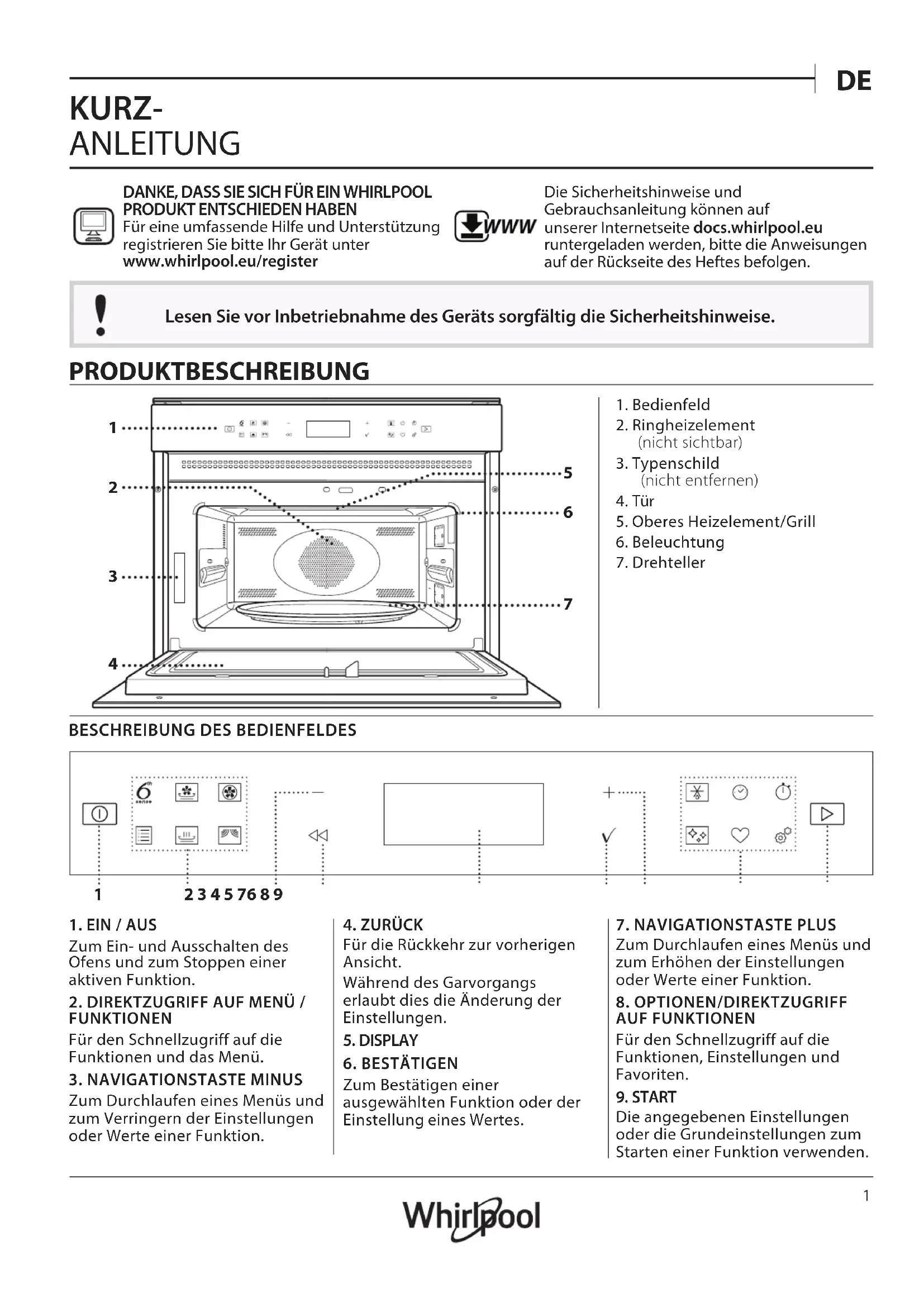 KURZ- ANLEITUNG DANKE, DASS SIE SICH FÜR EIN WHIRLPOOL PRODUKT ENTSCHIEDEN HABENFür eine umfassende Hilfe und Unterstützung registrieren Sie bitte Ihr Gerät unter www . whirlpool . eu/ register WWW Die Sicherheitshinweise und Gebrauchsanleitung können auf unserer Internetseite docs . whirlpool . eu runtergeladen werden, bitte die Anweisungen auf der Rückseite des Heftes befolgen. Lesen Sie vor Inbetriebnahme des Geräts sorgfältig die Sicherheitshinweise. PRODUKTBESCHREIBUNG 1. Bedienfeld2. Ringheizelement(nicht sichtbar)3. Typenschild(nicht entfernen)4. Tür5. Oberes Heizelement/Grill6. Beleuchtung7. DrehtellerBESCHREIBUNG DES BEDIENFELDES 2 3 4 5 76 8 91. EIN / AUSZum Ein- und Ausschalten desOfens und zum Stoppen eineraktiven Funktion.2. DIREKTZUGRIFF AUF MENÜ /FUNKTIONENFür den Schnellzugriff auf die Funktionen und das Menü. 3. NAVIGATIONSTASTE MINUSZum Durchlaufen eines Menüs undzum Verringern der Einstellungenoder Werte einer Funktion.4. ZURÜCKFür die Rückkehr zur vorherigenAnsicht.Während des Garvorgangserlaubt dies die Änderung derEinstellungen.5. DISPLAY6. BESTÄTIGENZum Bestätigen einerausgewählten Funktion oder derEinstellung eines Wertes.7. NAVIGATIONSTASTE PLUSZum Durchlaufen eines Menüs undzum Erhöhen der Einstellungenoder Werte einer Funktion.8. OPTIONEN/DIREKTZUGRIFFAUF FUNKTIONENFür den Schnellzugriff auf die Funktionen, Einstellungen und Favoriten.9. STARTDie angegebenen Einstellungenoder die Grundeinstellungen zumStarten einer Funktion verwenden.
