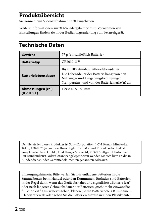 Nota Al abrir o cerrar la tapa del compartimiento de la pila, asegúrese de que la moneda o similar se ha insertado correctamente en la ranura de dicha tapa. Solución de problemas En el caso de que se produzca cualquier problema, consulte el manual de instrucciones del televisor. (ES) Produktübersicht Sie können nun Videoaufnahmen in 3D anschauen. Weitere Informationen zur 3D-Wiedergabe und zum Vornehmen von Einstellungen finden Sie in der Bedienungsanleitung zum Fernsehgerät. Technische Daten Gewicht 77 g (einschließlich Batterie) Batterietyp CR2032, 3 V Batterielebensdauer Bis zu 100 Stunden Batterielebensdauer Die Lebensdauer der Batterie hängt von den Nutzungs- und Umgebungsbedingungen (Temperatur) und von der Batteriemarke(n) ab. Abmessungen (ca.) (B × H × T) 179 × 40 × 183 mm Der Hersteller dieses Produktes ist Sony Corporation, 1-7-1 Konan Minato-ku Tokio, 108-0075 Japan. Bevollmächtigter für EMV und Produktsicherheit ist Sony Deutschland GmbH, Hedelfinger Strasse 61, 70327 Stuttgart, Deutschland. Für Kundendienst- oder Garantieangelegenheiten wenden Sie sich bitte an die in Kundendienst- oder Garantiedokumenten genannten Adressen. Entsorgungshinweis: Bitte werfen Sie nur entladene Batterien in die Sammelboxen beim Handel oder den Kommunen. Entladen sind Batterien in der Regel dann, wenn das Gerät abshaltet und signalisiert „Batterie leer“ oder nach längerer Gebrauchsdauer der Batterien „nicht mehr einwandfrei funktioniert“. Um sicherzugehen, kleben Sie die Batteriepole z.B. mit einem Klebestreifen ab oder geben Sie die Batterien einzeln in einen Plastikbeutel. (DE) Entsorgung von gebrauchten Batterien und Akkus (anzuwenden in den Ländern der Europäischen Union und anderen europäischen Ländern mit einem separaten Sammelsystem für diese Produkte) Das Symbol auf der Batterie/dem Akku oder der Verpackung weist darauf hin, dass diese nicht als normaler Haushaltsabfall zu behandeln sind. Ein zusätzliches chemisches Symbol Pb (Blei) oder Hg (Quecksilber) unter der durchgestrichenen Mülltonne bedeutet, dass die Batterie/der Akku einen Anteil von mehr als 0,0005% Quecksilber oder 0,004% Blei enthält. Durch Ihren Beitrag zum korrekten Entsorgen dieser Batterien/Akkus schützen Sie die Umwelt und die Gesundheit Ihrer Mitmenschen. Umwelt und Gesundheit werden durch falsches Entsorgen gefährdet. Materialrecycling hilft, den Verbrauch von Rohstoffen zu verringern. Bei Produkten, die auf Grund ihrer Sicherheit, der Funktionalität oder als Sicherung vor Datenverlust eine ständige Verbindung zur eingebauten Batterie benötigen, sollte die Batterie nur durch qualifiziertes Servicepersonal ausgetauscht werden. Um sicherzustellen, dass die Batterie korrekt entsorgt wird, geben Sie das Produkt zwecks Entsorgung an einer Annahmestelle für das Recycling von elektrischen und elektronischen Geräten ab. Für alle anderen Batterien entnehmen Sie die Batterie bitte entsprechend dem Kapitel über die sichere Entfernung der Batterie. Geben Sie die Batterie an einer Annahmestelle für das Recycling von Batterien/Akkus ab. Weitere Informationen über das Recycling dieses Produkts oder der Batterie erhalten Sie von Ihrer Gemeinde, den kommunalen Entsorgungsbetrieben oder dem Geschäft, in dem Sie das Produkt gekauft haben. Entsorgung der 3D Brille Entsorgung von gebrauchten elektrischen und elektronischen Geräten (anzuwenden in den Ländern der Europäischen Union und anderen europäischen Ländern mit einem separaten Sammelsystem für diese Geräte) Das Symbol auf dem Produkt oder seiner Verpackung weist darauf hin, dass dieses Produkt nicht als normaler Haushaltsabfall zu behandeln ist, sondern an einer Annahmestelle für das Recycling von elektrischen und elektronischen Geräten abgegeben werden muss. Durch Ihren Beitrag zum korrekten Entsorgen dieses Produkts schützen Sie die Umwelt und die Gesundheit Ihrer Mitmenschen. Umwelt und Gesundheit werden durch falsches Entsorgen gefährdet. Materialrecycling hilft, den Verbrauch von Rohstoffen zu verringern. Weitere Informationen zum Recycling dieses Produkts erhalten Sie bei Ihrer Gemeindeverwaltung, den kommunalen Entsorgungsbetrieben oder dem Geschäft, in dem Sie das Produkt gekauft haben. (DE)