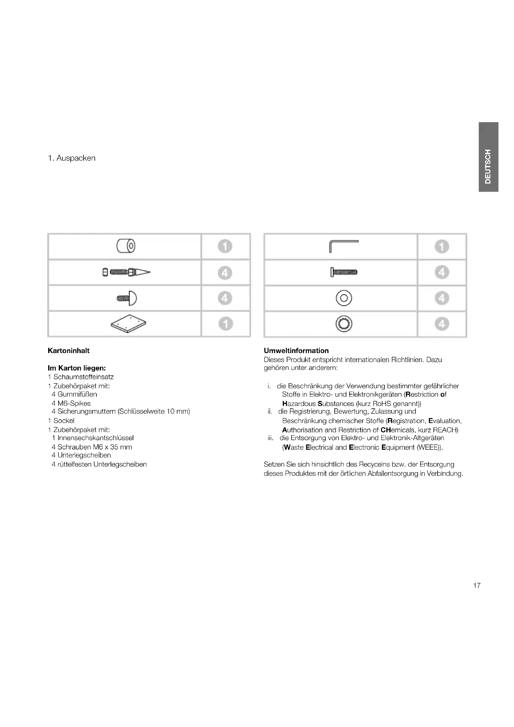 Kartoninhalt Im Karton liegen: 1 Schaumstoffeinsatz 1 Zubehörpaket mit: 4 Gummifüßen 4 M6-Spikes 4 Sicherungsmuttern (Schlüsselweite 10 mm) 1 Sockel 1 Zubehörpaket mit: 1 Innensechskantschlüssel 4 Schrauben M6 x 35 mm 4 Unterlegscheiben 4 rüttelfesten Unterlegscheiben Umweltinformation Dieses Produkt entspricht internationalen Richtlinien. Dazu gehören unter anderem:
