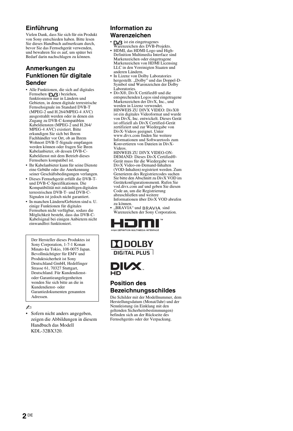 - In manchen Ländern/Gebieten sind u. U. einige Funktionen für digitales Fernsehen nicht verfügbar, sodass die Möglichkeit besteht, dass das DVB-CKabelsignal bei einigen Anbietern nicht einwandfrei funktioniert. Der Hersteller dieses Produktes ist Sony Corporation, 1-7-1 Konan Minato-ku Tokio, 108-0075 Japan. Bevollmächtigter für EMV und Produktsicherheit ist Sony Deutschland GmbH, Hedelfinger Strasse 61, 70327 Stuttgart, Deutschland. Für Kundendienstoder Garantieangelegenheiten wenden Sie sich bitte an die in Kundendienst- oder Garantiedokumenten genannten Adressen.