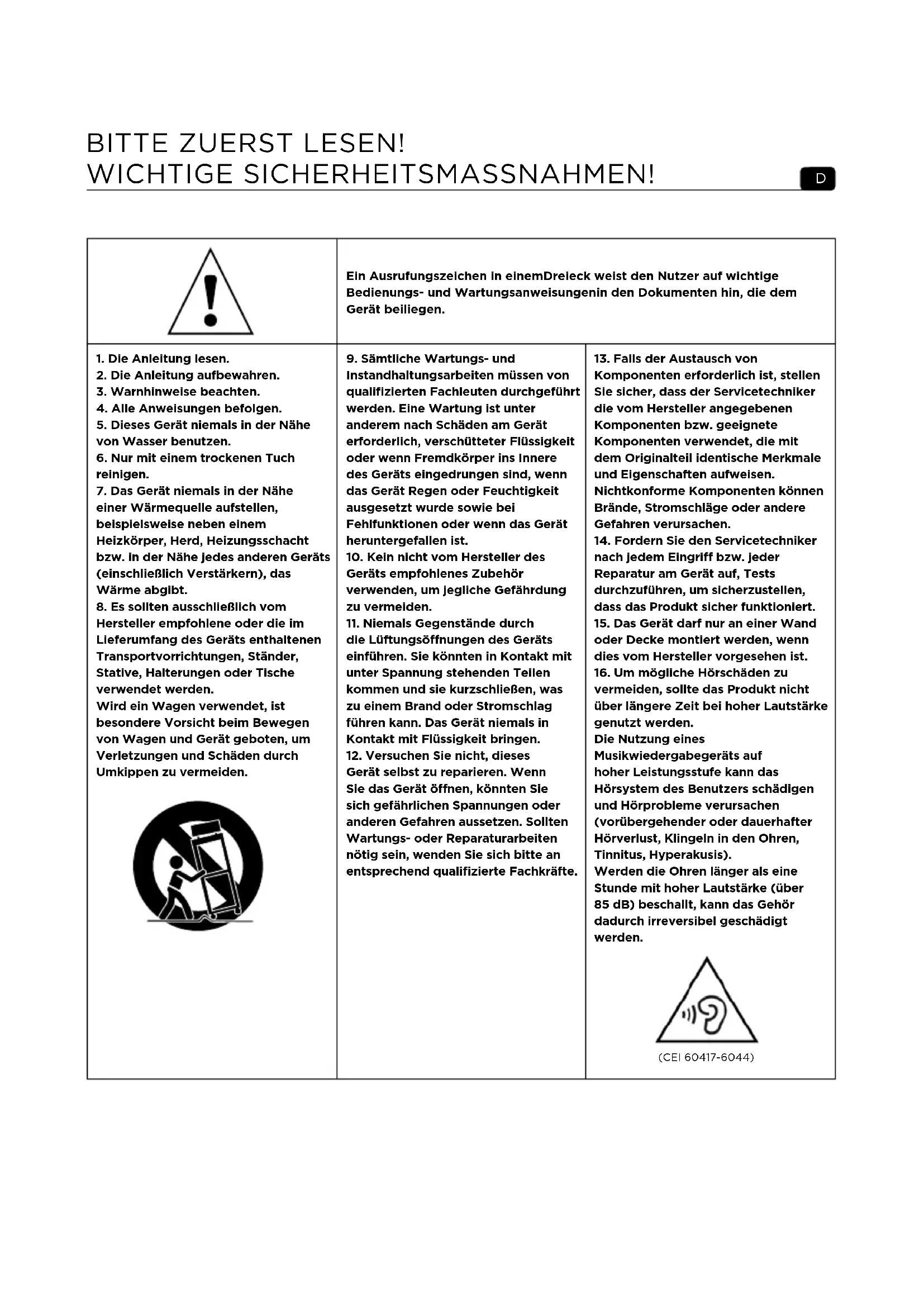 Ein Ausrufungszeichen in einemDreieck weist den Nutzer auf wichtige Bedienungs- und Wartungsanweisungenin den Dokumenten hin, die dem Gerät beiliegen.