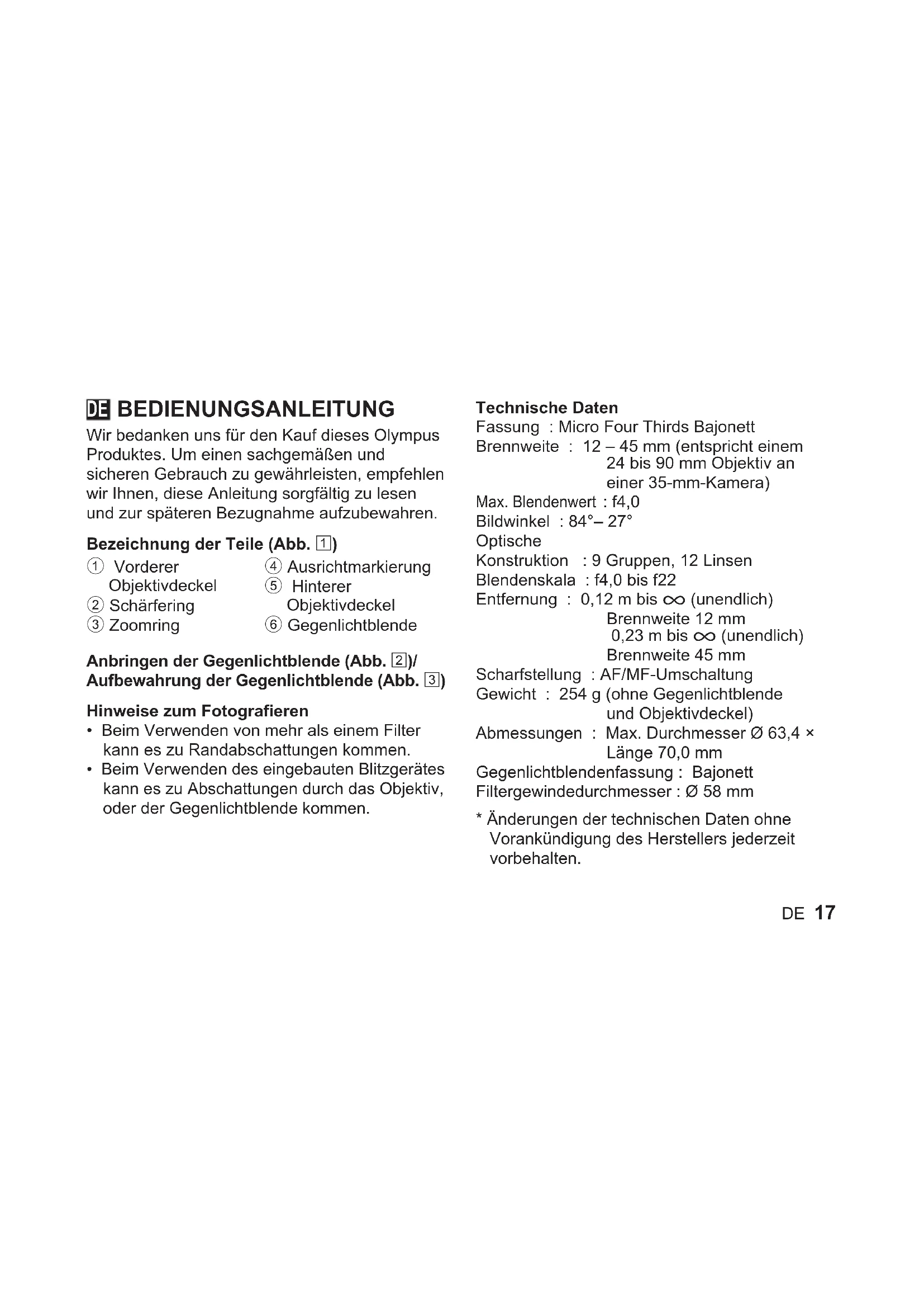 - Beim Verwenden des eingebauten Blitzgerätes kann es zu Abschattungen durch das Objektiv, oder der Gegenlichtblende kommen. Technische Daten Fassung : Micro Four Thirds Bajonett Brennweite : 12 – 45 mm (entspricht einem 24 bis 90 mm Objektiv an einer 35-mm-Kamera) Max. Blendenwert : f4,0 Bildwinkel : 84°– 27° Optische Konstruktion : 9 Gruppen, 12 Linsen Blendenskala : f4,0 bis f22 Entfernung : 0,12 m bis ) (unendlich) Brennweite 12 mm 0,23 m bis ) (unendlich) Brennweite 45 mm Scharfstellung : AF/MF-Umschaltung Gewicht : 254 g (ohne Gegenlichtblende und Objektivdeckel) Abmessungen : Max. Durchmesser Ø 63,4 × Länge 70,0 mm Gegenlichtblendenfassung : Bajonett Filtergewindedurchmesser : Ø 58 mm