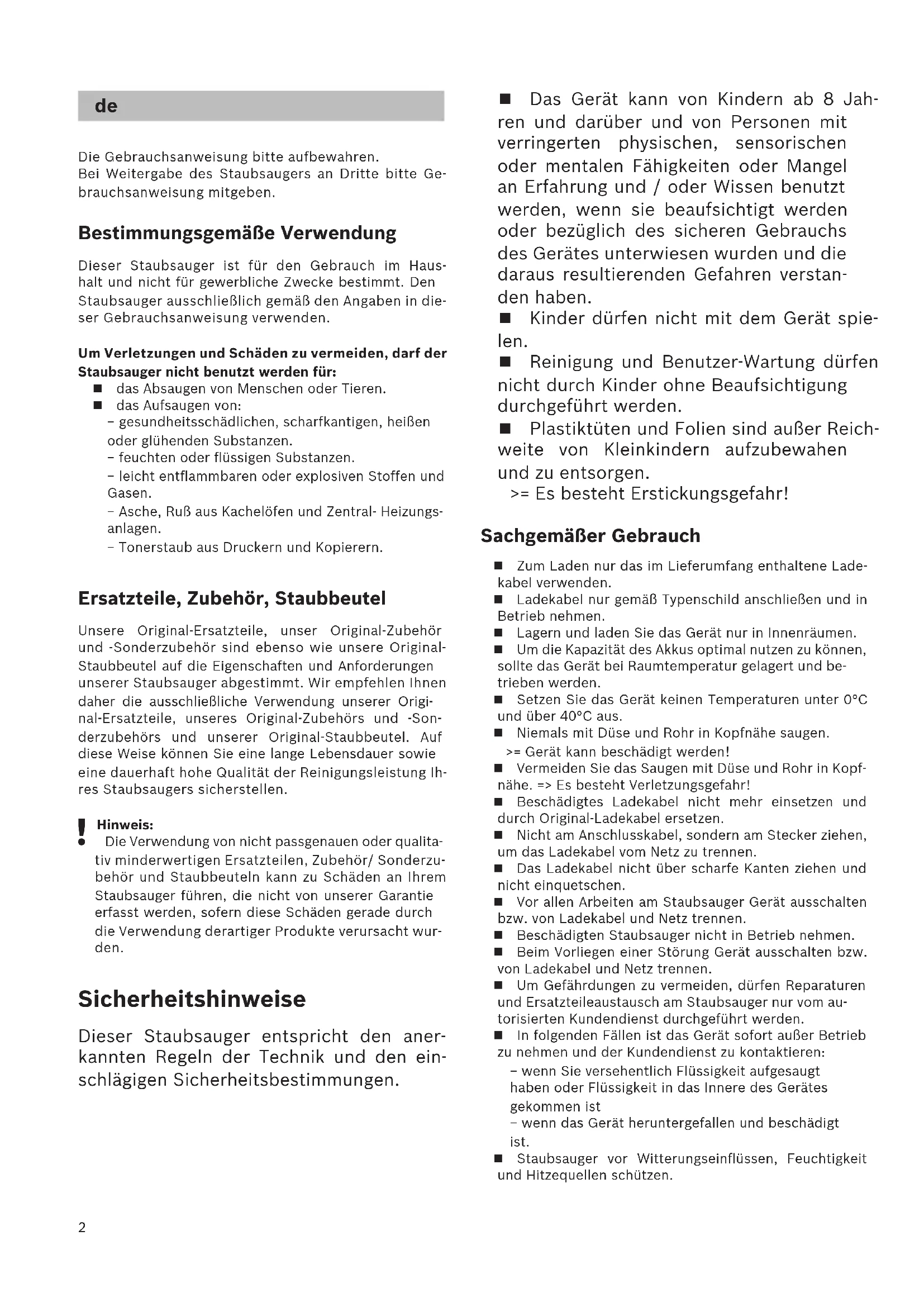 Hinweis: Die Verwendung von nicht passgenauen oder qualita- tiv minderwertigen Ersatzteilen, Zubehör/ Sonderzu- behör und Staubbeuteln kann zu Schäden an Ihrem Staubsauger führen, die nicht von unserer Garantie erfasst werden, sofern diese Schäden gerade durch die Verwendung derartiger Produkte verursacht wur- den. Sicherheitshinweise Dieser Staubsauger entspricht den aner- kannten Regeln der Technik und den ein- schlägigen Sicherheitsbestimmungen. Das Gerät kann von Kindern ab 8 Jah- ren und darüber und von Personen mit verringerten physischen, sensorischen oder mentalen Fähigkeiten oder Mangel an Erfahrung und / oder Wissen benutzt werden, wenn sie beaufsichtigt werden oder bezüglich des sicheren Gebrauchs des Gerätes unterwiesen wurden und die daraus resultierenden Gefahren verstan- den haben. Kinder dürfen nicht mit dem Gerät spie- len. Reinigung und Benutzer-Wartung dürfen nicht durch Kinder ohne Beaufsichtigung durchgeführt werden. Plastiktüten und Folien sind außer Reich- weite von Kleinkindern aufzubewahen und zu entsorgen. >= Es besteht Erstickungsgefahr! Sachgemäßer Gebrauch Zum Laden nur das im Lieferumfang enthaltene Lade- kabel verwenden. Ladekabel nur gemäß Typenschild anschließen und in Betrieb nehmen. Lagern und laden Sie das Gerät nur in Innenräumen. Um die Kapazität des Akkus optimal nutzen zu können, sollte das Gerät bei Raumtemperatur gelagert und be- trieben werden. Setzen Sie das Gerät keinen Temperaturen unter 0°C und über 40°C aus. Niemals mit Düse und Rohr in Kopfnähe saugen. >= Gerät kann beschädigt werden! Vermeiden Sie das Saugen mit Düse und Rohr in Kopf- nähe. => Es besteht Verletzungsgefahr! Beschädigtes Ladekabel nicht mehr einsetzen und durch Original-Ladekabel ersetzen. Nicht am Anschlusskabel, sondern am Stecker ziehen, um das Ladekabel vom Netz zu trennen. Das Ladekabel nicht über scharfe Kanten ziehen und nicht einquetschen. Vor allen Arbeiten am Staubsauger Gerät ausschalten bzw. von Ladekabel und Netz trennen. Beschädigten Staubsauger nicht in Betrieb nehmen. Beim Vorliegen einer Störung Gerät ausschalten bzw. von Ladekabel und Netz trennen. Um Gefährdungen zu vermeiden, dürfen Reparaturen und Ersatzteileaustausch am Staubsauger nur vom au- torisierten Kundendienst durchgeführt werden. In folgenden Fällen ist das Gerät sofort außer Betrieb zu nehmen und der Kundendienst zu kontaktieren: − wenn Sie versehentlich Flüssigkeit aufgesaugt haben oder Flüssigkeit in das Innere des Gerätes gekommen ist − wenn das Gerät heruntergefallen und beschädigt ist. Staubsauger vor Witterungseinflüssen, Feuchtigkeit und Hitzequellen schützen. de3 Keine brennbaren oder alkoholhaltigen Stoffe auf die Filter (Filterbeutel, Motorschutzfilter, Ausblasfilter etc.) geben. Staubsauger ist für den Baustellenbetrieb nicht geeig- net. =>Einsaugen von Bauschutt kann zur Beschädi- gung des Gerätes führen. Gerät ausschalten, wenn nicht gesaugt wird. Aus Sicherheitsgründen, um Akku und Motor zu schüt- zen, ist das Gerät mit einem Überhitzungsschutz aus- gestattet. Sollten Akku oder Gerät zu warm werden, schaltet das Gerät automatisch ab. Das Gerät muss ca. 30 Minuten abkühlen, bevor es wieder einsatzbereit ist. Die Verpackung schützt den Staubsauger vor Beschä- digung auf dem Transport. Deshalb empfehlen wir, die Verpackung für Transportzwecke aufzubewahren. Batterien Ihr Gerät ist mit Lithium Ionen Akkus ausgestattet, die aus Sicherheitsgründen nur professionellen Reperatur- Fachleuten zugänglich sind. Bitte wenden Sie sich zum Austausch der Akkus an das nächstgelegene Kundendienstcenter oder den autori- sierten Fachhändler. Hinweise zur Entsorgung Verpackung Die Verpackung schützt den Staubsauger vor Be- schädigung auf dem Transport. Sie besteht aus umweltfreundlichen Materialien und ist deshalb recycelbar. Entsorgen Sie nicht mehr benötigte Ver- packungsmaterialien an den Sammelstellen für das Verwertungssystem »Grüner Punkt«. Altgerät Dieses Gerät enthält wieder aufladbare Lithium Io- nen Akkus. Deshalb darf das Gerät nur über den au- torisierten Kundendienst und Fachhandel entsorgt werden. Please keep this instruction manual for future refe- rence. When passing the vacuum cleaner on to a third party, please also pass on this instruction manual. Intended use This appliance is intended for domestic use only, not for commercial use. Only use this vacuum cleaner in accordance with the information provided in this ins- truction manual. In order to prevent injuries and damage, the vacuum cleaner must not be used for: Vacuuming persons or animals. Vacuuming up: − Hazardous, sharp-edged, hot or red-hot substances. − Damp or liquid substances. − Highly flammable or explosive substances and gases. − Ash, soot from tiled stoves and central heating systems. − Toner dust from printers and copiers. Spare parts, accessories, dust bags Our original spare parts, original (special) accessories and original dust bags are designed to work with the features and requirements of our vacuum cleaners. We therefore recommend that you only use our original spa- re parts, original (special) accessories and original dust bags. This will ensure that your vacuum cleaner has a long service life and that the quality of its cleaning per- formance will remain consistently high throughout.