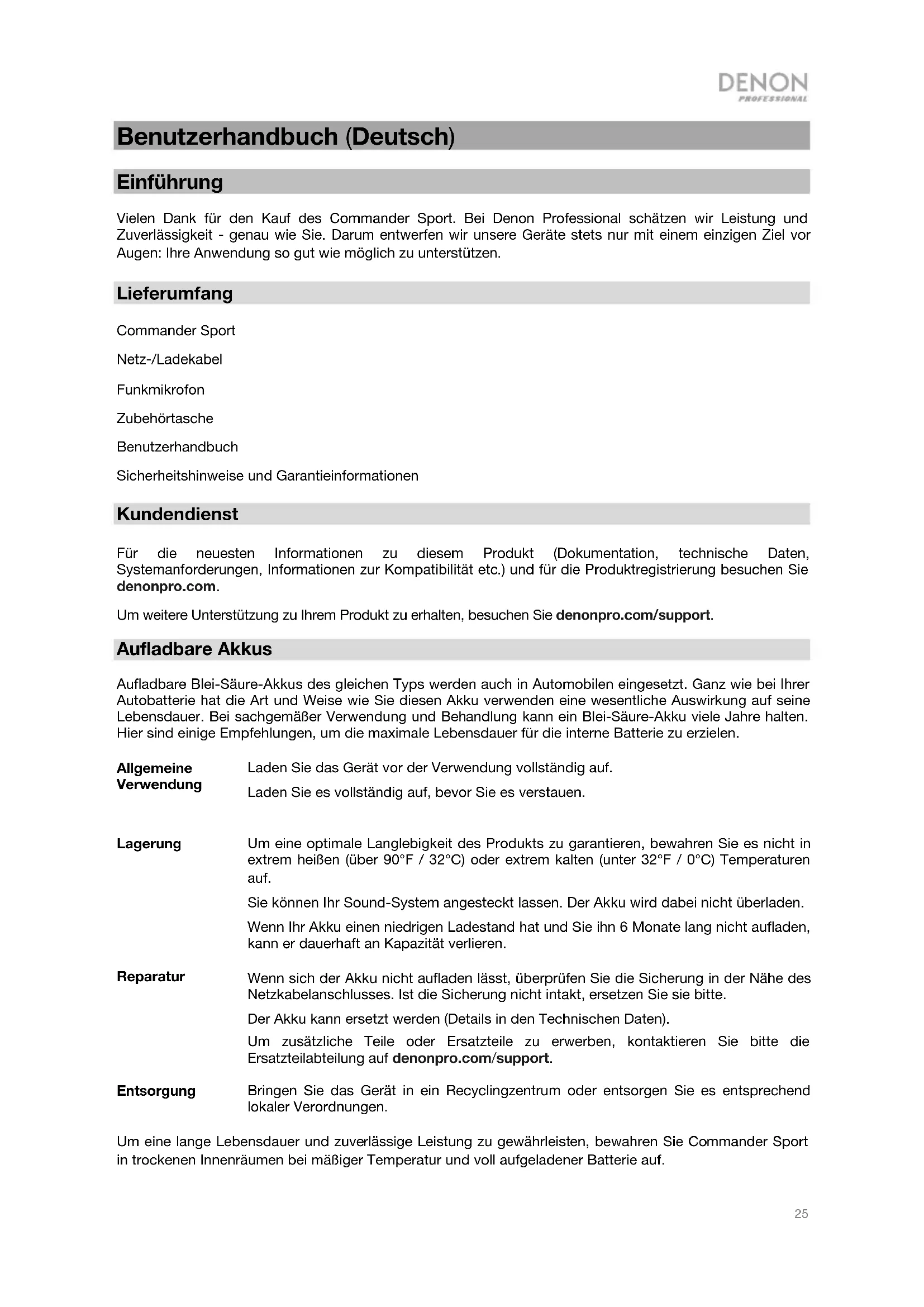 Lieferumfang Commander Sport Netz-/Ladekabel Funkmikrofon Zubehörtasche Benutzerhandbuch Sicherheitshinweise und Garantieinformationen Kundendienst Für die neuesten Informationen zu diesem Produkt (Dokumentation, technische Daten, Systemanforderungen, Informationen zur Kompatibilität etc.) und für die Produktregistrierung besuchen Sie denonpro.com. Um weitere Unterstützung zu Ihrem Produkt zu erhalten, besuchen Sie denonpro.com/support. Aufladbare Akkus Aufladbare Blei-Säure-Akkus des gleichen Typs werden auch in Automobilen eingesetzt. Ganz wie bei Ihrer Autobatterie hat die Art und Weise wie Sie diesen Akku verwenden eine wesentliche Auswirkung auf seine Lebensdauer. Bei sachgemäßer Verwendung und Behandlung kann ein Blei-Säure-Akku viele Jahre halten. Hier sind einige Empfehlungen, um die maximale Lebensdauer für die interne Batterie zu erzielen. Allgemeine Verwendung Laden Sie das Gerät vor der Verwendung vollständig auf. Laden Sie es vollständig auf, bevor Sie es verstauen. Lagerung Um eine optimale Langlebigkeit des Produkts zu garantieren, bewahren Sie es nicht in extrem heißen (über 90°F / 32°C) oder extrem kalten (unter 32°F / 0°C) Temperaturen auf. Sie können Ihr Sound-System angesteckt lassen. Der Akku wird dabei nicht überladen. Wenn Ihr Akku einen niedrigen Ladestand hat und Sie ihn 6 Monate lang nicht aufladen, kann er dauerhaft an Kapazität verlieren. Reparatur Wenn sich der Akku nicht aufladen lässt, überprüfen Sie die Sicherung in der Nähe des Netzkabelanschlusses. Ist die Sicherung nicht intakt, ersetzen Sie sie bitte. Der Akku kann ersetzt werden (Details in den Technischen Daten). Um zusätzliche Teile oder Ersatzteile zu erwerben, kontaktieren Sie bitte die Ersatzteilabteilung auf denonpro.com/support. Entsorgung Bringen Sie das Gerät in ein Recyclingzentrum oder entsorgen Sie es entsprechend lokaler Verordnungen. Um eine lange Lebensdauer und zuverlässige Leistung zu gewährleisten, bewahren Sie Commander Sport in trockenen Innenräumen bei mäßiger Temperatur und voll aufgeladener Batterie auf.26