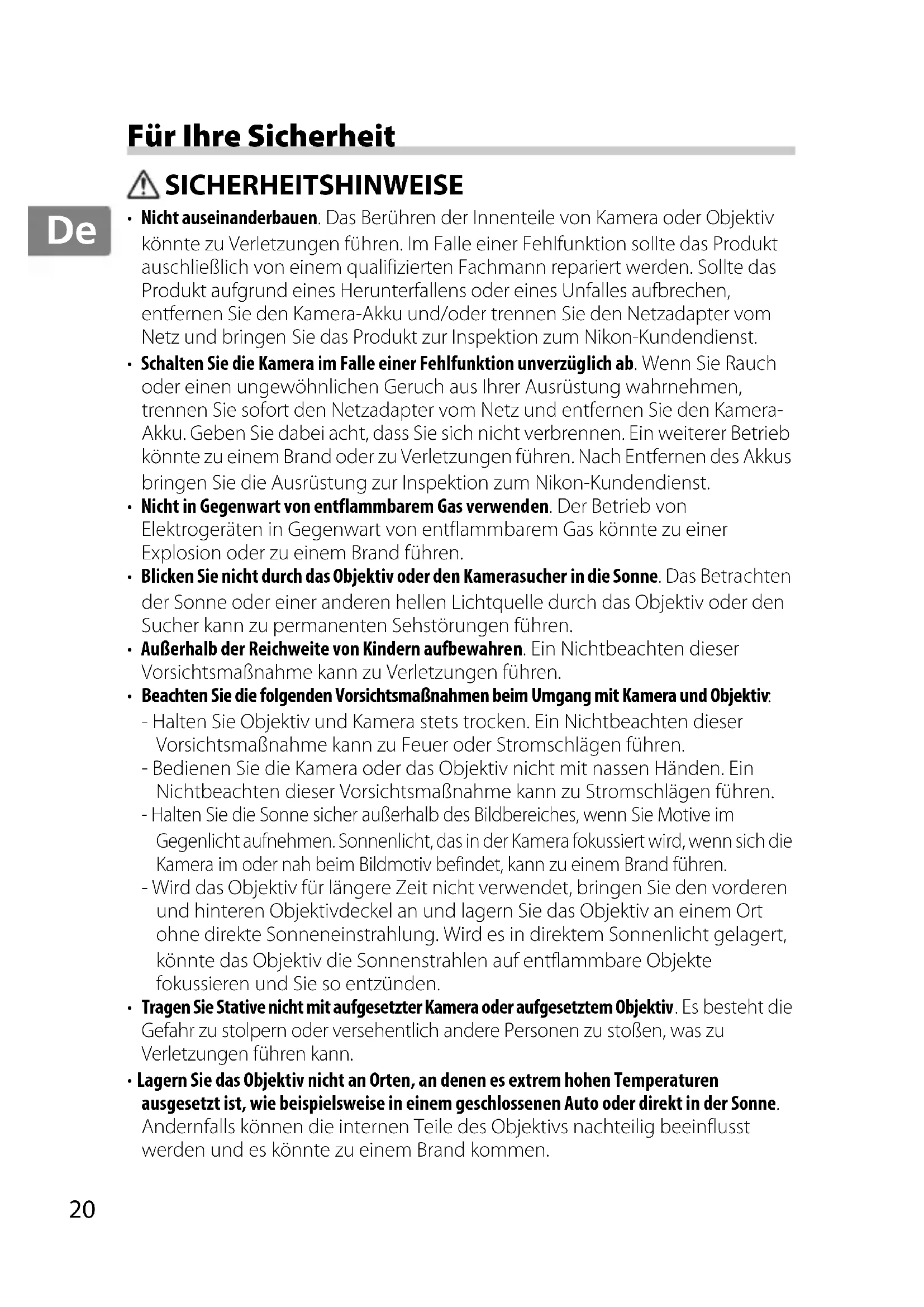 - Nicht auseinanderbauen. Das Berühren der Innenteile von Kamera oder Objektiv könnte zu Verletzungen führen. Im Falle einer Fehlfunktion sollte das Produkt auschließlich von einem qualifizierten Fachmann repariert werden. Sollte das Produkt aufgrund eines Herunterfallens oder eines Unfalles aufbrechen, entfernen Sie den Kamera-Akku und/oder trennen Sie den Netzadapter vom Netz und bringen Sie das Produkt zur Inspektion zum Nikon-Kundendienst.