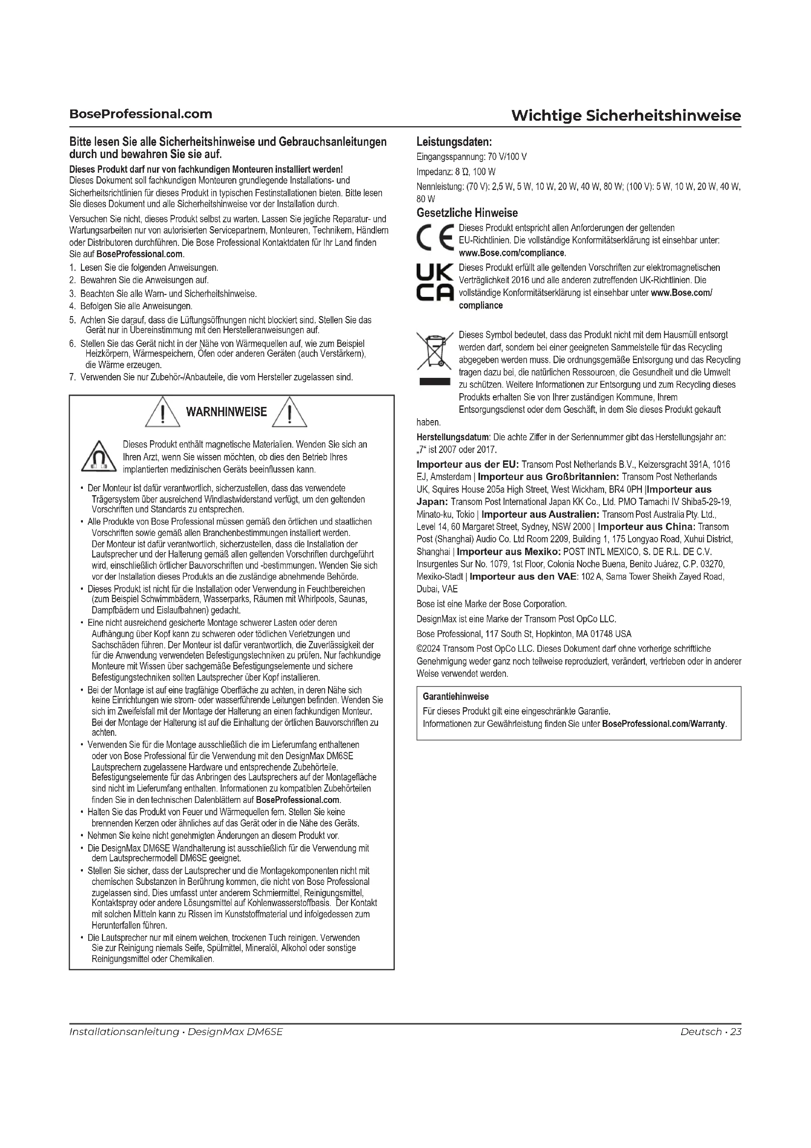 - Die Lautsprecher nur mit einem weichen, trockenen Tuch reinigen. Verwenden Sie zur Reinigung niemals Seife, Spülmittel, Mineralöl, Alkohol oder sonstige Reinigungsmittel oder Chemikalien. Leistungsdaten: Eingangsspannung: 70 V/100 V Impedanz: 8 Ώ, 100 W Nennleistung: (70 V): 2,5 W, 5 W, 10 W, 20 W, 40 W, 80 W; (100 V): 5 W, 10 W, 20 W, 40 W, 80 W Gesetzliche Hinweise Dieses Produkt entspricht allen Anforderungen der geltenden EU-Richtlinien. Die vollständige Konformitätserklärung ist einsehbar unter: www.Bose.com/compliance. Dieses Produkt erfüllt alle geltenden Vorschriften zur elektromagnetischen Verträglichkeit 2016 und alle anderen zutreffenden UK-Richtlinien. Die vollständige Konformitätserklärung ist einsehbar unter www.Bose.com/ compliance Dieses Symbol bedeutet, dass das Produkt nicht mit dem Hausmüll entsorgt werden darf, sondern bei einer geeigneten Sammelstelle für das Recycling abgegeben werden muss. Die ordnungsgemäße Entsorgung und das Recycling tragen dazu bei, die natürlichen Ressourcen, die Gesundheit und die Umwelt zu schützen. Weitere Informationen zur Entsorgung und zum Recycling dieses Produkts erhalten Sie von Ihrer zuständigen Kommune, Ihrem Entsorgungsdienst oder dem Geschäft, in dem Sie dieses Produkt gekauft haben. Herstellungsdatum: Die achte Ziffer in der Seriennummer gibt das Herstellungsjahr an: „7“ ist 2007 oder 2017. Importeur aus der EU: Transom Post Netherlands B.V., Keizersgracht 391A, 1016 EJ, Amsterdam | Importeur aus Großbritannien: Transom Post Netherlands UK, Squires House 205a High Street, West Wickham, BR4 0PH |Importeur aus Japan: Transom Post International Japan KK Co., Ltd. PMO Tamachi IV Shiba5-29-19, Minato-ku, Tokio | Importeur aus Australien: Transom Post Australia Pty. Ltd., Level 14, 60 Margaret Street, Sydney, NSW 2000 | Importeur aus China: Transom Post (Shanghai) Audio Co. Ltd Room 2209, Building 1, 175 Longyao Road, Xuhui District, Shanghai | Importeur aus Mexiko: POST INTL MEXICO, S. DE R.L. DE C.V. Insurgentes Sur No. 1079, 1st Floor, Colonia Noche Buena, Benito Juárez, C.P. 03270, Mexiko-Stadt | Importeur aus den VAE: 102 A, Sama Tower Sheikh Zayed Road, Dubai, VAE Bose ist eine Marke der Bose Corporation. DesignMax ist eine Marke der Transom Post OpCo LLC. Bose Professional, 117 South St, Hopkinton, MA 01748 USA ©2024 Transom Post OpCo LLC. Dieses Dokument darf ohne vorherige schriftliche Genehmigung weder ganz noch teilweise reproduziert, verändert, vertrieben oder in anderer Weise verwendet werden. Garantiehinweise Für dieses Produkt gilt eine eingeschränkte Garantie. Informationen zur Gewährleistung nden Sie unter BoseProfessional.com/Warranty.24 • Deutsch DesignMax DM6SE • Installationsanleitung BoseProfessional.com Übersicht Verpackungsinhalt Produktabmessungen ×2 ×2 ×2 ×2 267mm 210mm 222mm 223mm 229mm 245mm 340mm Technische Spezifikationen Weitere technische Spezifikationen können Sie dem technischen Datenblatt für den DesignMax DM6SE auf BoseProfessional.com entnehmen. Material, Abmessungen, Gewicht Produktabmessungen Höhe: 340mm Breite: 222mm Tiefe: 229mm Nettogewicht– Lautsprecher mit Abdeckgitter und Halterung (1 Stück) 6,4kg Versandgewicht (2 Stück) 14,74kg Wichtige Installationshinweise Bitte lesen Sie vor der Installation des Lautsprechers den Abschnitt Wichtige Sicherheitshinweise auf Seite 23. Ø 5,5mmDeutsch • 25Installationsanleitung • DesignMax DM6SE BoseProfessional.com Systemeinrichtung Installationsoptionen Installationsoptionen und Montagezubehör q Montagehalterung (im Lieferumfang enthalten) w Surface-Mount Pan and Tilt Bracket (optional) CMBS2 Deckenhalterung (optional, nur für die Verwendung im Innenbereich) Pole Mount Bracket (optional)