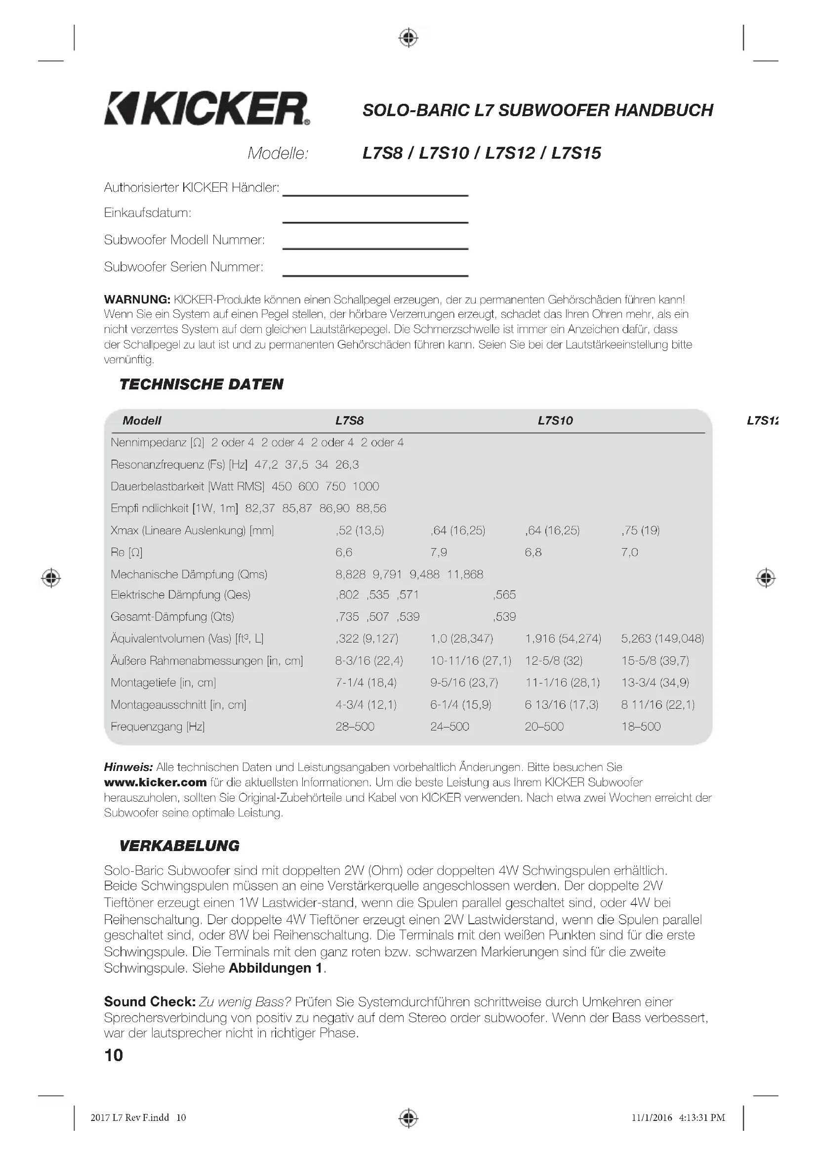 Authorisierter KICKER Händler: Einkaufsdatum: Subwoofer Modell Nummer: Subwoofer Serien Nummer: Modell L7S8 L7S10 L7S12 L7S15 Nennimpedanz [Ω] 2 oder 4 2 oder 4 2 oder 4 2 oder 4 Resonanzfrequenz (Fs) [Hz] 47,2 37,5 34 26,3 Dauerbelastbarkeit [Watt RMS] 450 600 750 1000 Empfi ndlichkeit [1W, 1m] 82,37 85,87 86,90 88,56 Xmax (Lineare Auslenkung) [mm] ,52 (13,5) ,64 (16,25) ,64 (16,25) ,75 (19) Re [Ω] 6,6 7,9 6,8 7,0 Mechanische Dämpfung (Qms) 8,828 9,791 9,488 11,868 Elektrische Dämpfung (Qes) ,802 ,535 ,571 ,565 Gesamt-Dämpfung (Qts) ,735 ,507 ,539 ,539 Äquivalentvolumen (Vas) [ft³, L] ,322 (9,127) 1,0 (28,347) 1,916 (54,274) 5,263 (149,048) Äußere Rahmenabmessungen [in, cm] 8-3/16 (22,4) 10-11/16 (27,1) 12-5/8 (32) 15-5/8 (39,7) Montagetiefe [in, cm] 7-1/4 (18,4) 9-5/16 (23,7) 11-1/16 (28,1) 13-3/4 (34,9) Montageausschnitt [in, cm] 4-3/4 (12,1) 6-1/4 (15,9) 6 13/16 (17,3) 8 11/16 (22,1) Frequenzgang [Hz] 28–500 24–500 20–500 18–500 L7S8 / L7S10 / L7S12 / L7S15Modelle: Hinweis: Alle technischen Daten und Leistungsangaben vorbehaltlich Änderungen. Bitte besuchen Sie www.kicker.com für die aktuellsten Informationen. Um die beste Leistung aus Ihrem KICKER Subwoofer herauszuholen, sollten Sie Original-Zubehörteile und Kabel von KICKER verwenden. Nach etwa zwei Wochen erreicht der Subwoofer seine optimale Leistung. Sound Check: Zu wenig Bass? Prüfen Sie Systemdurchführen schrittweise durch Umkehren einer Sprechersverbindung von positiv zu negativ auf dem Stereo order subwoofer. Wenn der Bass verbessert, war der lautsprecher nicht in richtiger Phase. WARNUNG: KICKER-Produkte können einen Schallpegel erzeugen, der zu permanenten Gehörschäden führen kann! Wenn Sie ein System auf einen Pegel stellen, der hörbare Verzerrungen erzeugt, schadet das Ihren Ohren mehr, als ein nicht verzerrtes System auf dem gleichen Lautstärkepegel. Die Schmerzschwelle ist immer ein Anzeichen dafür, dass der Schallpegel zu laut ist und zu permanenten Gehörschäden führen kann. Seien Sie bei der Lautstärkeeinstellung bitte vernünftig. 2017 L7 Rev F.indd 102017 L7 Rev F.indd 10 11/1/2016 4:13:31 PM11/1/2016 4:13:31 PM11