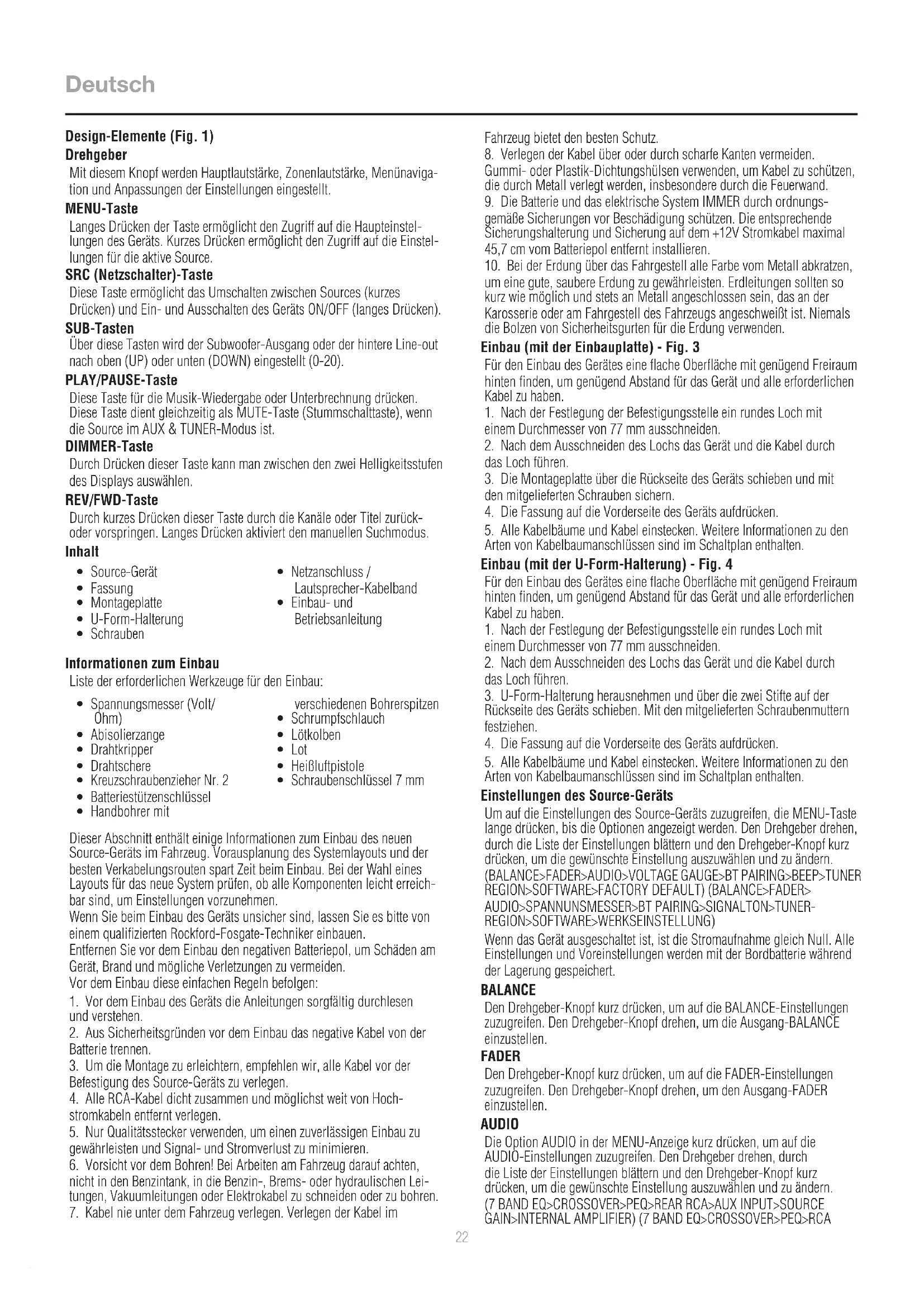 Arten von Kabelbaumanschlüssen sind im Schaltplan enthalten. Einstellungen des Source-Geräts Um auf die Einstellungen des Source-Geräts zuzugreifen, die MENU-Taste lange drücken, bis die Optionen angezeigt werden. Den Drehgeber drehen, durch die Liste der Einstellungen blättern und den Drehgeber-Knopf kurz drücken, um die gewünschte Einstellung auszuwählen und zu ändern. (BALANCE>FADER>AUDIO>VOLTAGE GAUGE>BT PAIRING>BEEP>TUNER