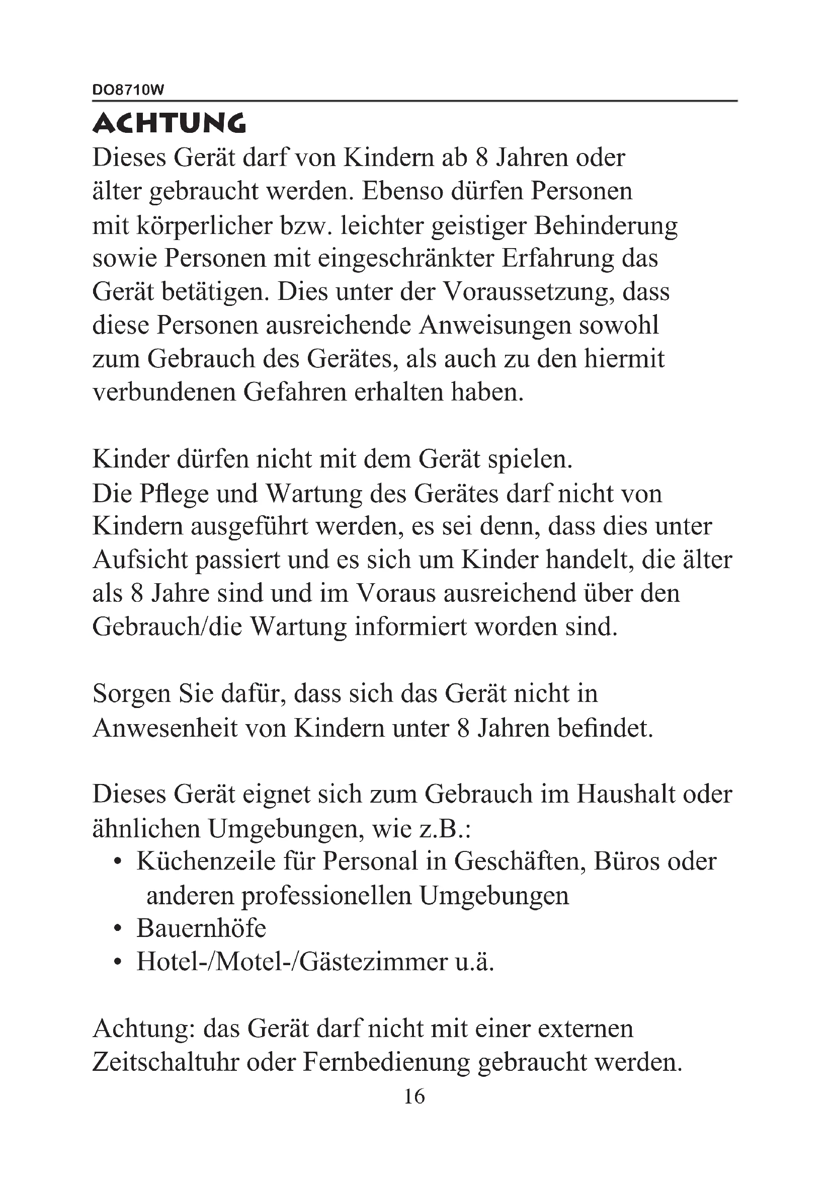 - Hotel-/Motel-/Gästezimmer u.ä. Achtung: das Gerät darf nicht mit einer externen Zeitschaltuhr oder Fernbedienung gebraucht werden. 16DO8710W Warnung :