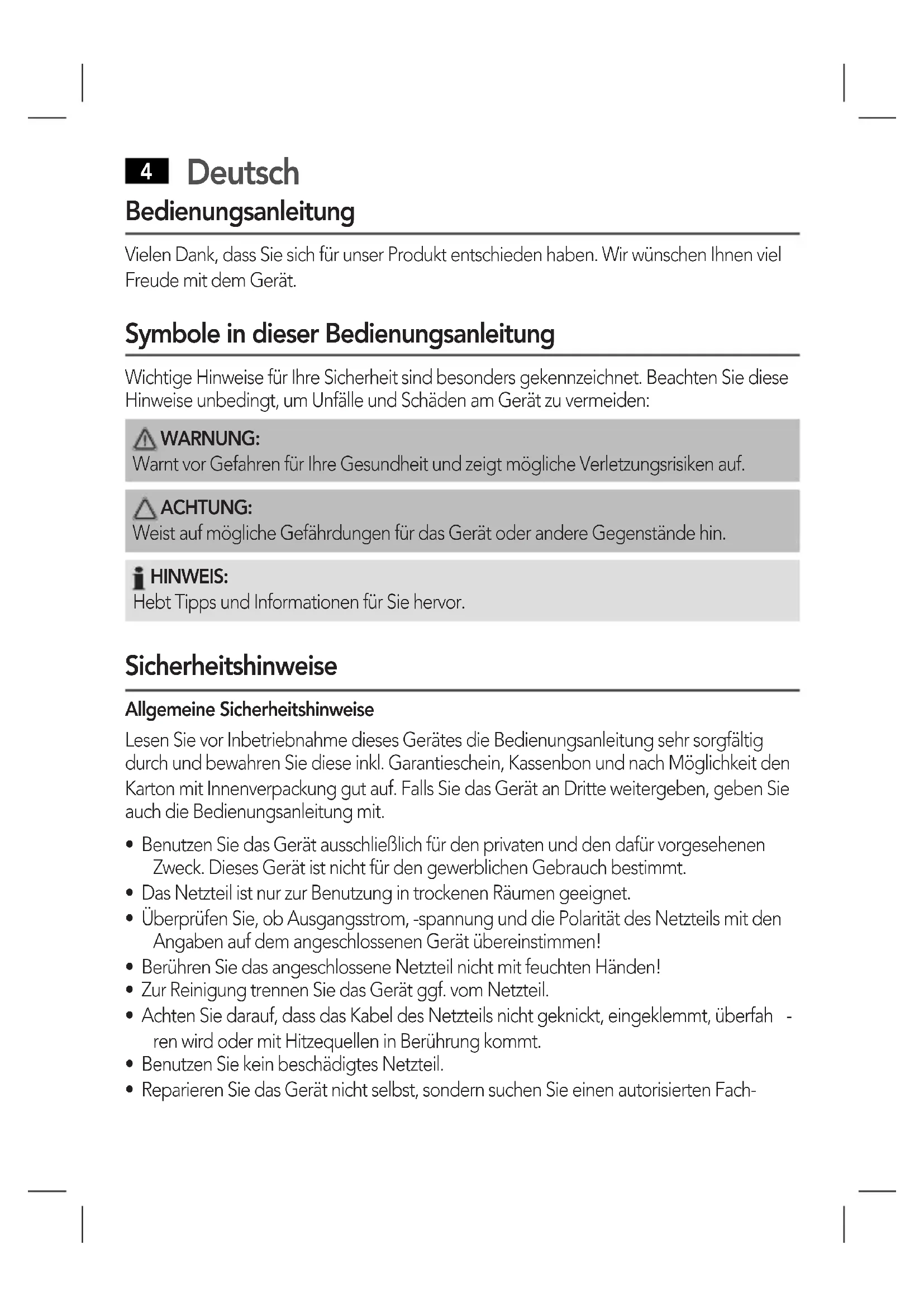 - Benutzen Sie kein anderes als das im Liefer- umfang enthaltene Netzteil.Deutsch