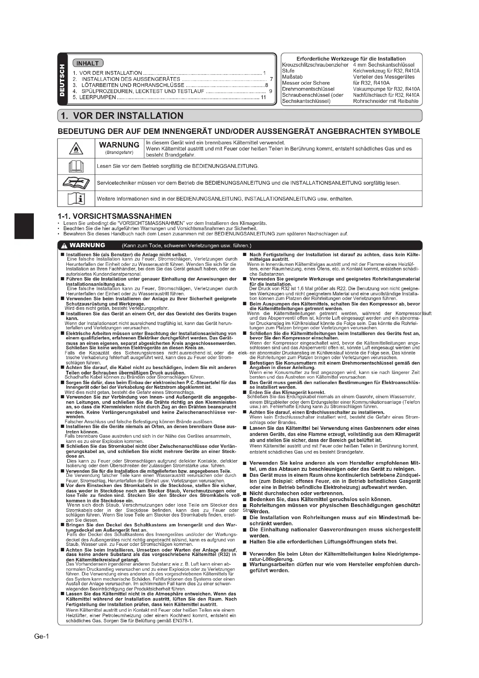 Schließen Sie das Stromkabel nicht über Zwischenanschlüsse oder Verlän- gerungskabel an, und schließen Sie nicht mehrere Geräte an einer Steck-dose an. Dies kann zu Feuer oderStromschlägen aufgrund defekter Kontakte, defekter IsolierungoderdemÜberschreitenderzulässigenStromstärkeusw.führen. Verwenden Sie für die Installation die mitgelieferten bzw. angegebenen Teile. DieVerwendung falscher Teile kann einen Wasseraustritt verursachen oderdurch Feuer,Stromschlag,HerunterfallenderEinheitusw.Verletzungenverursachen. Vor dem Einstecken des Stromkabels in die Steckdose, stellen Sie sicher, dass weder in Steckdose noch am Stecker Staub, Verschmutzungen oder lose Teile zu nden sind. Stecken Sie den Stecker des Stromkabels voll-kommen in die Steckdose ein. Wenn sichdochStaub, Verschmutzungen oderloseTeile amSteckerdes Stromkabelsoder in der Steckdose benden, kann dies zu Feuer oder Strom-schlägenführen.WennSieloseTeileamSteckerdesStromkabelsnden,erset-zenSiediesen. Bringen Sie den Deckel des Schaltkastens am Innengerät und den War-tungsdeckel am Außengerät fest an. Falls der Deckel des Schaltkastensdes Innengerätes und/oder der Wartungs- deckeldesAußengerätesnichtrichtigangebrachtist/sind,kannesaufgrundvonStaub,Wasserusw.zuFeueroderStromschlägenkommen. Achten Sie beim Installieren, Umsetzen oder Warten der Anlage darauf, dass keine andere Substanz als das vorgeschriebene Kältemittel (R32) in den Kältemittelkreislauf gelangt. DasVorhandenseinirgendeineranderenSubstanzwiez.B.Luftkanneinenab-normalenDruckanstiegverursachenundzueinerExplosionoderzuVerletzungenführen.DieVerwendungeinesanderenalsdesvorgeschriebenenKältemittelsfürdasSystemkannmechanischeSchäden,FehlfunktionendesSystemsodereinenAusfallderAnlageverursachen.ImschlimmstenFallkanndieszueinerschwer-wiegendenBeeinträchtigungderProduktsicherheitführen. Lassen Sie das Kältemittel nicht in die Atmosphäre entweichen. Wenn das Kältemittel während der Installation austritt, lüften Sie den Raum. Nach Fertigstellung der Installation prüfen, dass kein Kältemittel austritt. WennKältemittelaustrittundinKontaktmitFeueroderheißenTeilenwieeinem Heizlüfter,einer Petroleumheizung odereinem Kochherd kommt, entsteht ein schädlichesGas.SorgenSiefürBelüftunggemäßEN378-1. Nach Fertigstellung der Installation ist darauf zu achten, dass kein Kälte-mittelgas austritt. WenninInnenräumenKältemittelgasaustrittundmitderFlammeeinesHeizlüf-ters,einerRaumheizung,einesOfens,etc.inKontaktkommt,entstehenschädli-cheSubstanzen. Verwenden Sie geeignete Werkzeuge und geeignetes Rohrleitungsmaterial für die Installation. DerDruckvonR32ist1,6MalgrößeralsR22.DieBenutzungvonnichtgeeigne- tenWerkzeugenundnichtgeeignetemMaterialundeineunvollständigeInstalla-tionkönnenzumPlatzenderRohrleitungenoderVerletzungenführen. Beim Auspumpen des Kältemittels, schalten Sie den Kompressor ab, bevor die Kältemittelleitungen getrennt werden. Wenn die Kältemittelleitungen getrennt werden, während der Kompressorläuft unddasAbsperrventiloffenist,könnteLufteingesaugtwerdenundeinabnorma- lerDruckanstiegimKühlkreislaufkönntedieFolgesein.DaskönntedieRohrlei-tungenzumPlatzenbringenoderVerletzungenverursachen. Schließen Sie die Kältemittelleitungen beim Installieren des Geräts fest an, bevor Sie den Kompressor einschalten. WennderKompressor eingeschaltet wird, bevordie Kältemittelleitungen ange- schlossensindunddasAbsperrventiloffenist,könnteLufteingesaugtwerdenundeinabnormalerDruckanstiegimKühlkreislaufkönntedieFolgesein.DaskönntedieRohrleitungenzumPlatzenbringenoderVerletzungenverursachen. Befestigen Sie Konusmuttern mit einem Drehmomentschlüssel gemäß den Angaben in dieser Anleitung. Wenn eine Konusmutter zufest angezogen wird, kannsie nach längerer Zeit berstenunddasAustretenvonKältemittelverursachen. Das Gerät muss gemäß den nationalen Bestimmungen für Elektroanschlüs-se installiert werden. Erden Sie das Klimagerät korrekt. SchließenSiedasErdungskabelniemalsaneinemGasrohr,einemWasserrohr, einemBlitzableiteroderdemErdungsleitereinerKommunikationsanlage(Telefon usw.)an.FehlerhafteErdungkannzuStromschlägenführen. Achten Sie darauf, einen Erdschlussschalter zu installieren. Wennkein Erdschlussschalter installiert wird, besteht die Gefahr eines Strom- schlagsoderBrandes.