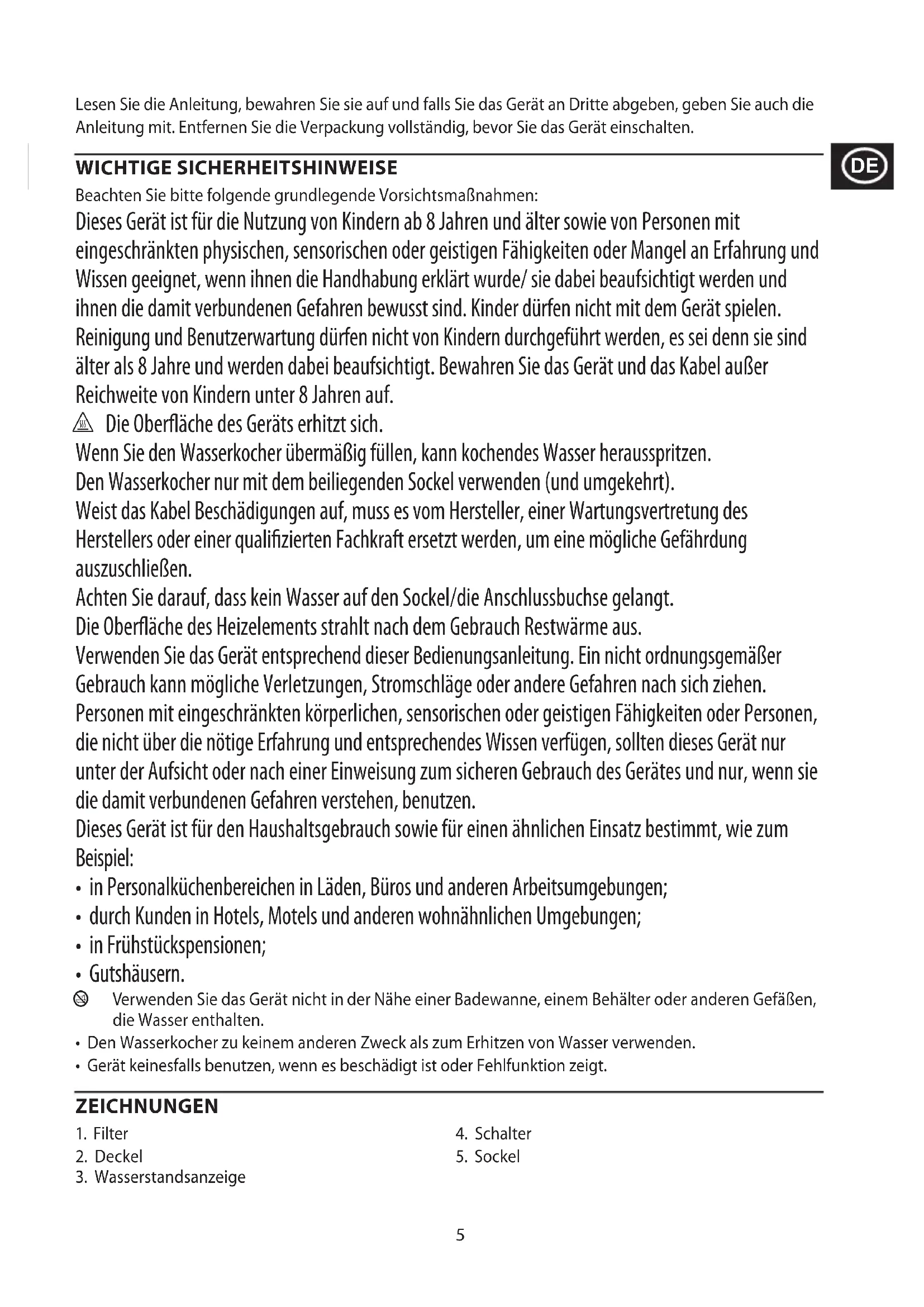 - Den Wasserkocher zu keinem anderen Zweck als zum Erhitzen von Wasser verwenden.