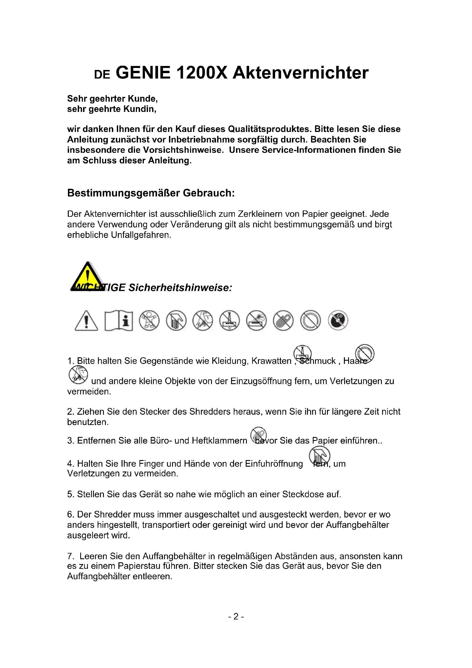Version/ Versión/ Versione: 06/2017- 2 - DE GENIE 1200X Aktenvernichter Sehr geehrter Kunde, sehr geehrte Kundin, wir danken Ihnen für den Kauf dieses Qualitätsproduktes. Bitte lesen Sie diese Anleitung zunächst vor Inbetriebnahme sorgfältig durch. Beachten Sie insbesondere die Vorsichtshinweise. Unsere Service-Informationen finden Sie am Schluss dieser Anleitung.