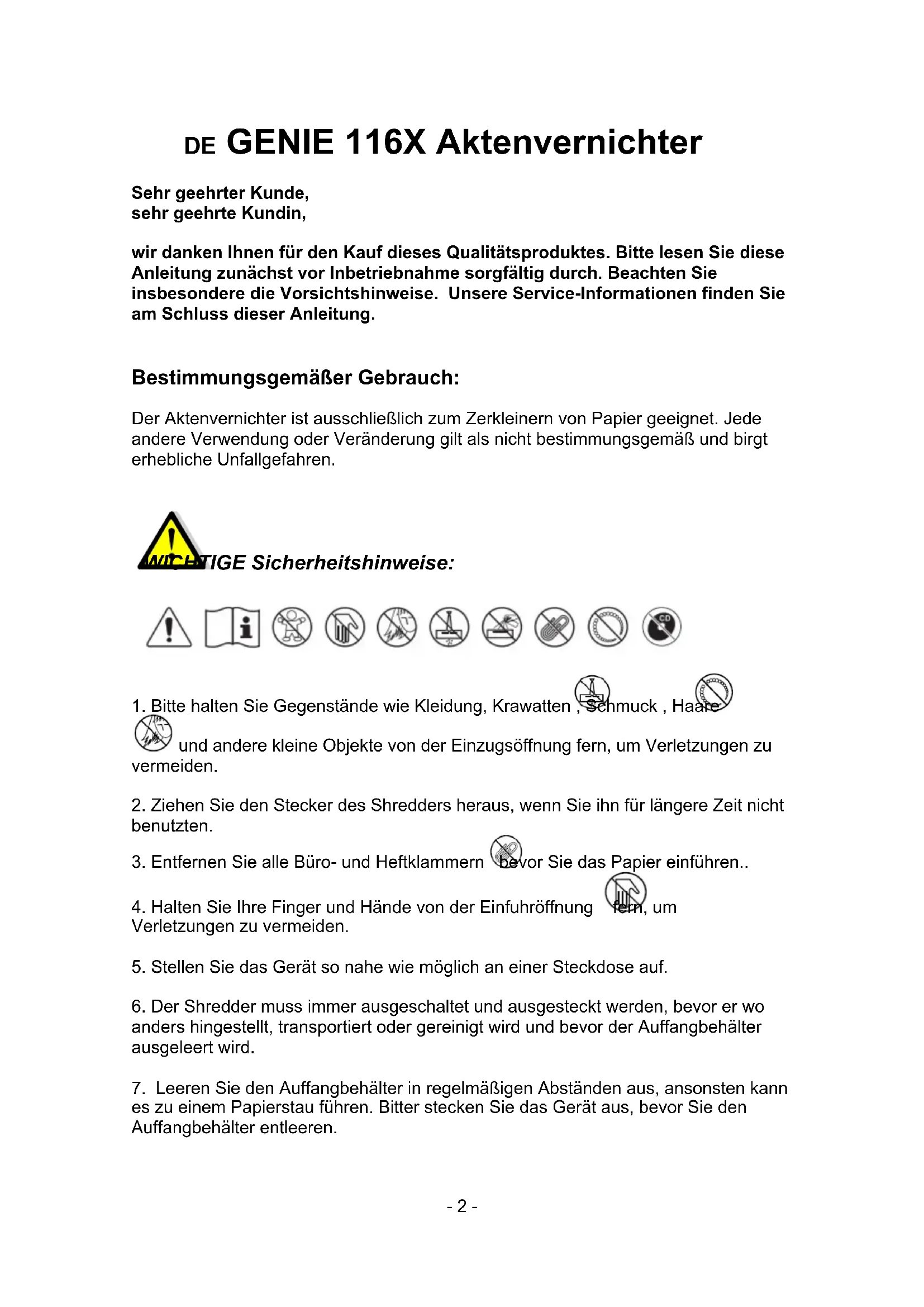 Version/ Versión/ Versione: 04/2017- 2 - DE GENIE 116X Aktenvernichter Sehr geehrter Kunde, sehr geehrte Kundin, wir danken Ihnen für den Kauf dieses Qualitätsproduktes. Bitte lesen Sie diese Anleitung zunächst vor Inbetriebnahme sorgfältig durch. Beachten Sie insbesondere die Vorsichtshinweise. Unsere Service-Informationen finden Sie am Schluss dieser Anleitung.