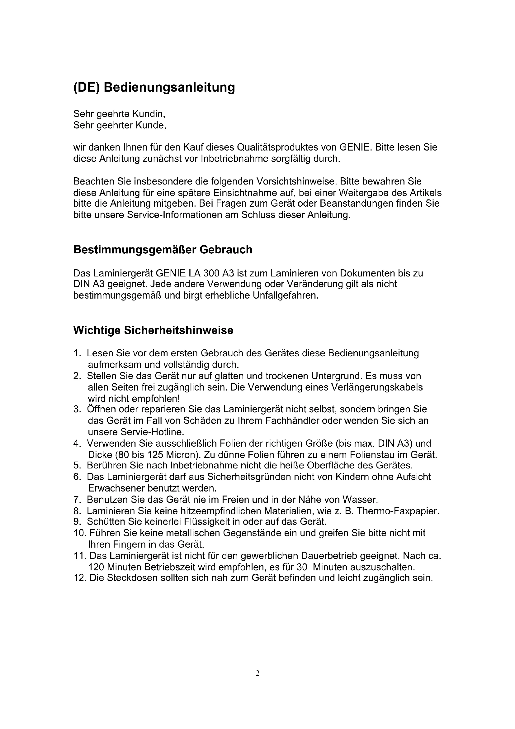 Bestimmungsgemäßer Gebrauch Das Laminiergerät GENIE LA 300 A3 ist zum Laminieren von Dokumenten bis zu DIN A3 geeignet. Jede andere Verwendung oder Veränderung gilt als nicht bestimmungsgemäß und birgt erhebliche Unfallgefahren.