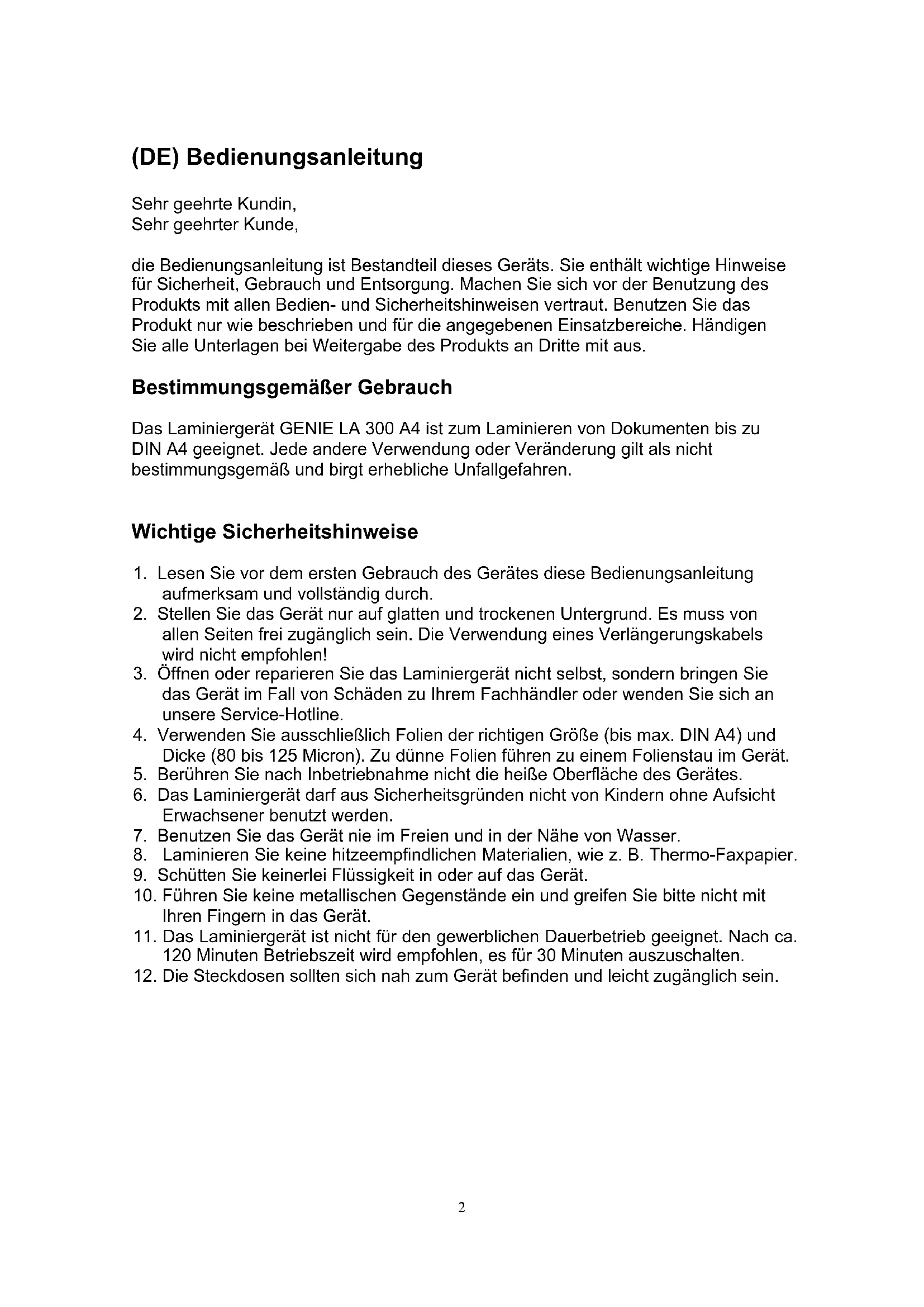 ID: 124692 (DE) Bedienungsanleitung Sehr geehrte Kundin, Sehr geehrter Kunde, die Bedienungsanleitung ist Bestandteil dieses Geräts. Sie enthält wichtige Hinweise für Sicherheit, Gebrauch und Entsorgung. Machen Sie sich vor der Benutzung des Produkts mit allen Bedien- und Sicherheitshinweisen vertraut. Benutzen Sie das Produkt nur wie beschrieben und für die angegebenen Einsatzbereiche. Händigen Sie alle Unterlagen bei Weitergabe des Produkts an Dritte mit aus. Bestimmungsgemäßer Gebrauch Das Laminiergerät GENIE LA 300 A4 ist zum Laminieren von Dokumenten bis zu DIN A4 geeignet. Jede andere Verwendung oder Veränderung gilt als nicht bestimmungsgemäß und birgt erhebliche Unfallgefahren.