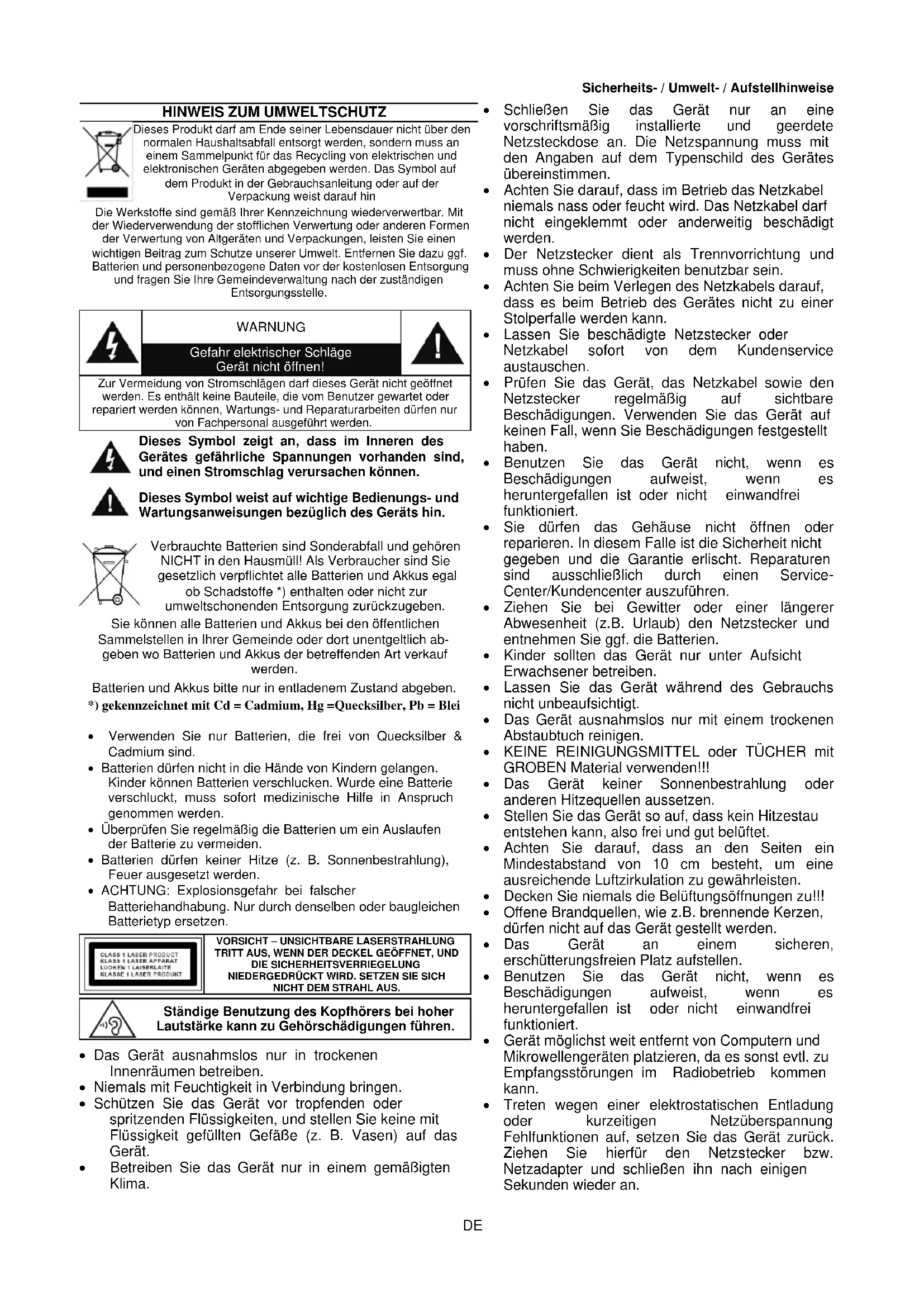 Sie können alle Batterien und Akkus bei den öffentlichen Sammelstellen in Ihrer Gemeinde oder dort unentgeltlich ab- geben wo Batterien und Akkus der betreffenden Art verkauf werden. Batterien und Akkus bitte nur in entladenem Zustand abgeben. *) gekennzeichnet mit Cd = Cadmium, Hg =Quecksilber, Pb = Blei