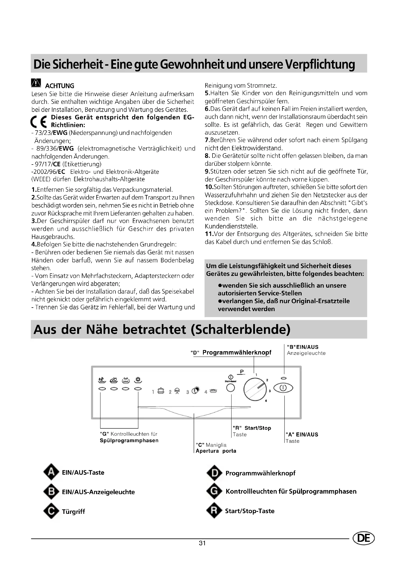 Die Sicherheit - Eine gute Gewohnheit und unsere Verpflichtung ACHTUNG Lesen Sie bitte die Hinweise dieser Anleitung aufmerksam durch. Sie enthalten wichtige Angaben über die Sicherheit bei der Installation, Benutzung und Wartung des Gerätes. Dieses Gerät entspricht den folgenden EG- Richtlinien: - 73/23/EWG (Niederspannung) und nachfolgenden Änderungen; - 89/336/EWG (elektromagnetische Verträglichkeit) und nachfolgenden Änderungen. - 97/17/CE (Etikettierung) -2002/96/EC Elektro- und Elektronik-Altgeräte (WEEE) dürfen Elektrohaushalts-Altgeräte 1.Entfernen Sie sorgfältig das Verpackungsmaterial. 2.Sollte das Gerät wider Erwarten auf dem Transport zu Ihnen beschädigt worden sein, nehmen Sie es nicht in Betrieb ohne zuvor Rücksprache mit Ihrem Lieferanten gehalten zu haben. 3.Der Geschirrspüler darf nur von Erwachsenen benutzt werden und ausschließlich für Geschirr des privaten Hausgebrauchs. 4.Befolgen Sie bitte die nachstehenden Grundregeln: - Berühren oder bedienen Sie niemals das Gerät mit nassen Händen oder barfuß, wenn Sie auf nassem Bodenbelag stehen. - Vom Einsatz von Mehrfachsteckern, Adaptersteckern oder Verlängerungen wird abgeraten; - Achten Sie bei der Installation darauf, daß das Speisekabel nicht geknickt oder gefährlich eingeklemmt wird. - Trennen Sie das Gerätz im Fehlerfall, bei der Wartung und Aus der Nähe betrachtet (Schalterblende) Um die Leistungsfähigkeit und Sicherheit dieses Gerätes zu gewährleisten, bitte folgendes beachten: l wenden Sie sich ausschließlich an unsere autorisierten Service-Stellen l verlangen Sie, daß nur Original-Ersatzteile verwendet werden EIN/AUS-Taste EIN/AUS-Anzeigeleuchte Türgriff Kontrollleuchten für Spülprogrammphasen Start/Stop-Taste Programmwählerknopf "D" Programmwählerknopf"B"EIN/AUSAnzeigeleuchte"A" EIN/AUSTaste"G" Kontrollleuchten