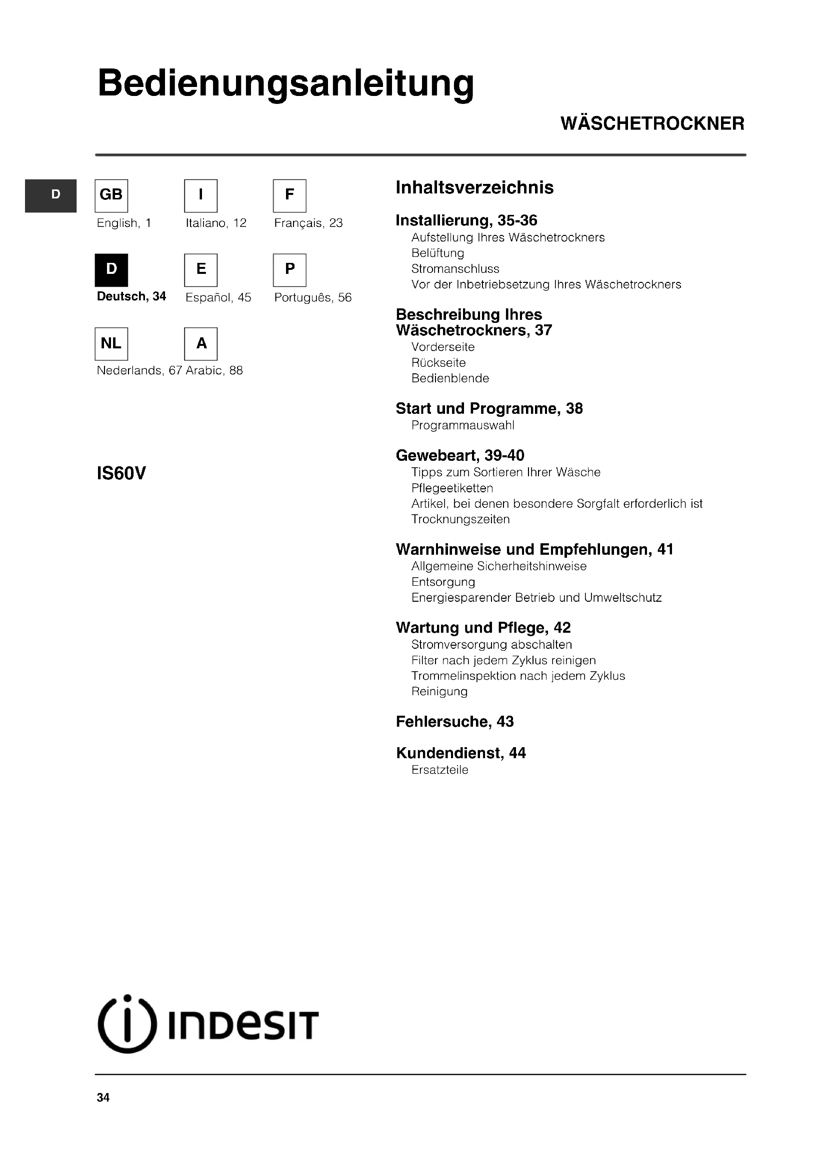 33Inhaltsverzeichnis WÄSCHETROCKNER IS60V Bedienungsanleitung Installierung, 35-36 Aufstellung Ihres Wäschetrockners Belüftung Stromanschluss Vor der Inbetriebsetzung Ihres Wäschetrockners Beschreibung Ihres Wäschetrockners, 37 Vorderseite Rückseite Bedienblende Start und Programme, 38 Programmauswahl Gewebeart, 39-40 Tipps zum Sortieren Ihrer Wäsche Pflegeetiketten Artikel, bei denen besondere Sorgfalt erforderlich ist Trocknungszeiten Warnhinweise und Empfehlungen, 41 Allgemeine Sicherheitshinweise Entsorgung Energiesparender Betrieb und Umweltschutz Wartung und Pflege, 42 Stromversorgung abschalten Filter nach jedem Zyklus reinigen Trommelinspektion nach jedem Zyklus Reinigung Fehlersuche, 43 Kundendienst, 44 Ersatzteile