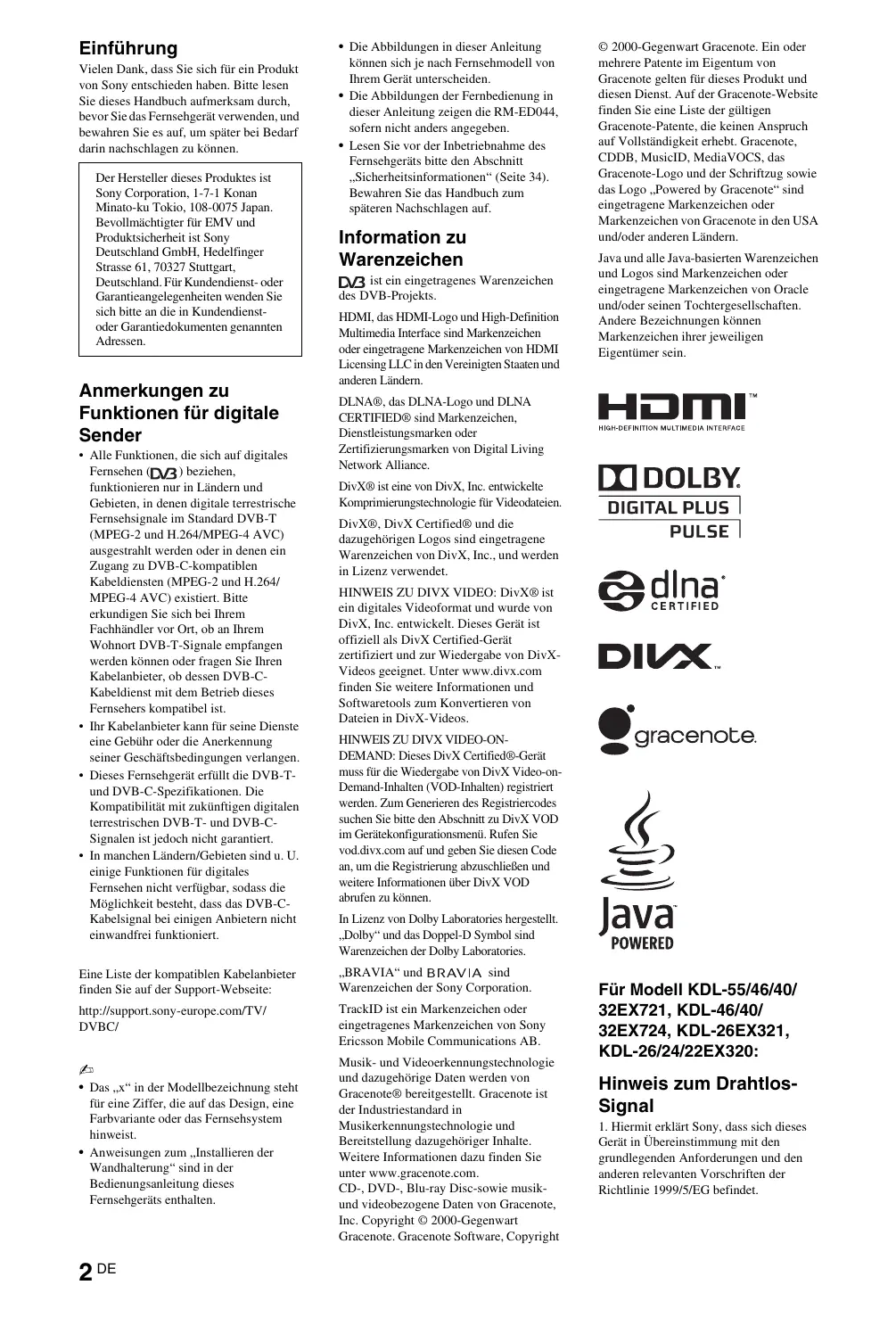 Laden Sie die Anleitung für Ihr Fernseher kostenlos im PDF-Format! Finden Sie Ihr Handbuch KDL-46EX724 - SONY und nehmen Sie Ihr elektronisches Gerät wieder in die Hand. Auf dieser Seite sind alle Dokumente veröffentlicht, die für die Verwendung Ihres Geräts notwendig sind. KDL-46EX724 von der Marke SONY.