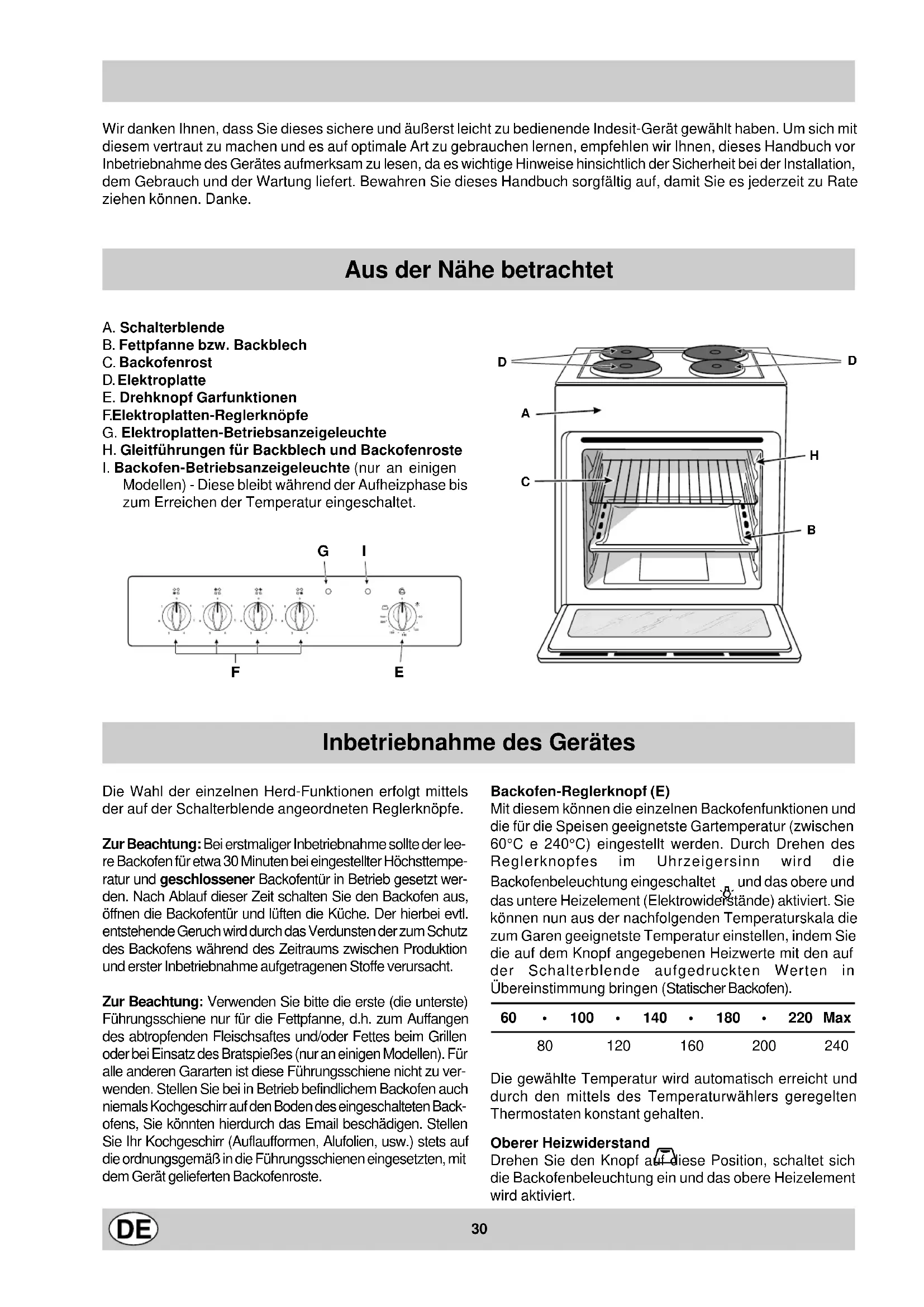 Dit apparaat voldoet aan de volgende EEG Richtlijnen: - 73/23/EEG van 19/02/73 (laagspanning) en successievelijke modificaties; - 89/336/ EEG van 03/05/89 (elektromagnetische compatibiliteit) en successievelijke modificaties; - 93/68/EEG van 22/07/93 en successievelijke modificaties;30 Wir danken Ihnen, dass Sie dieses sichere und äußerst leicht zu bedienende Indesit-Gerät gewählt haben. Um sich mit diesem vertraut zu machen und es auf optimale Art zu gebrauchen lernen, empfehlen wir Ihnen, dieses Handbuch vor Inbetriebnahme des Gerätes aufmerksam zu lesen, da es wichtige Hinweise hinsichtlich der Sicherheit bei der Installation, dem Gebrauch und der Wartung liefert. Bewahren Sie dieses Handbuch sorgfältig auf, damit Sie es jederzeit zu Rate ziehen können. Danke. Aus der Nähe betrachtet A. Schalterblende B. Fettpfanne bzw. Backblech C. Backofenrost D. Elektroplatte E. Drehknopf Garfunktionen F. Elektroplatten-Reglerknöpfe G. Elektroplatten-Betriebsanzeigeleuchte H. Gleitführungen für Backblech und Backofenroste