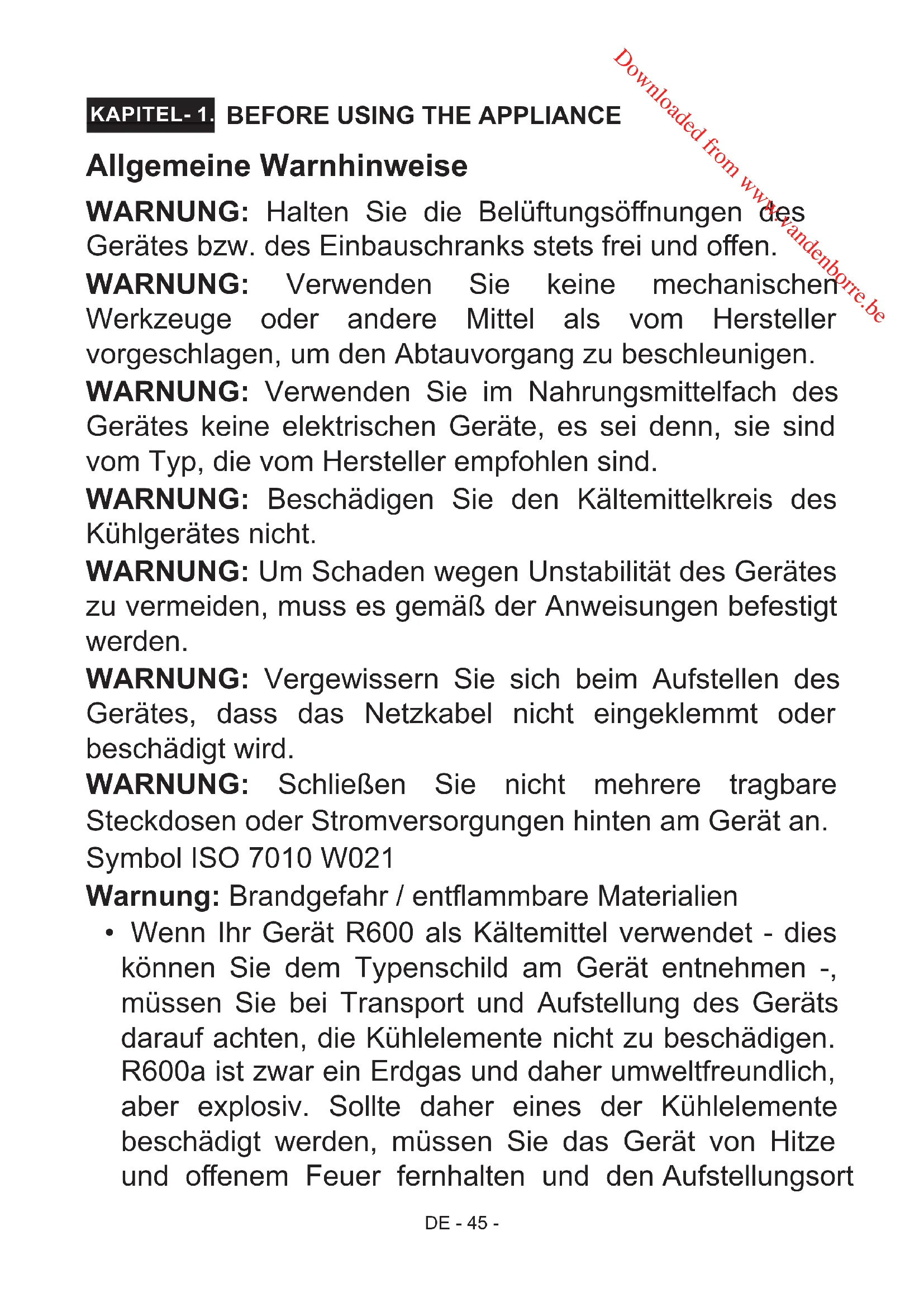 KAPITEL- 1. Allgemeine Warnhinweise WARNUNG: Halten Sie die Belüftungsönungen des Gerätes bzw. des Einbauschranks stets frei und oen. WARNUNG: Verwenden Sie keine mechanischen Werkzeuge oder andere Mittel als vom Hersteller vorgeschlagen, um den Abtauvorgang zu beschleunigen. WARNUNG: Verwenden Sie im Nahrungsmittelfach des Gerätes keine elektrischen Geräte, es sei denn, sie sind vom Typ, die vom Hersteller empfohlen sind. WARNUNG: Beschädigen Sie den Kältemittelkreis des Kühlgerätes nicht. WARNUNG: Um Schaden wegen Unstabilität des Gerätes zu vermeiden, muss es gemäß der Anweisungen befestigt werden. WARNUNG: Vergewissern Sie sich beim Aufstellen des Gerätes, dass das Netzkabel nicht eingeklemmt oder beschädigt wird. WARNUNG: Schließen Sie nicht mehrere tragbare Steckdosen oder Stromversorgungen hinten am Gerät an. Symbol ISO 7010 W021 Warnung: Brandgefahr / entammbare Materialien