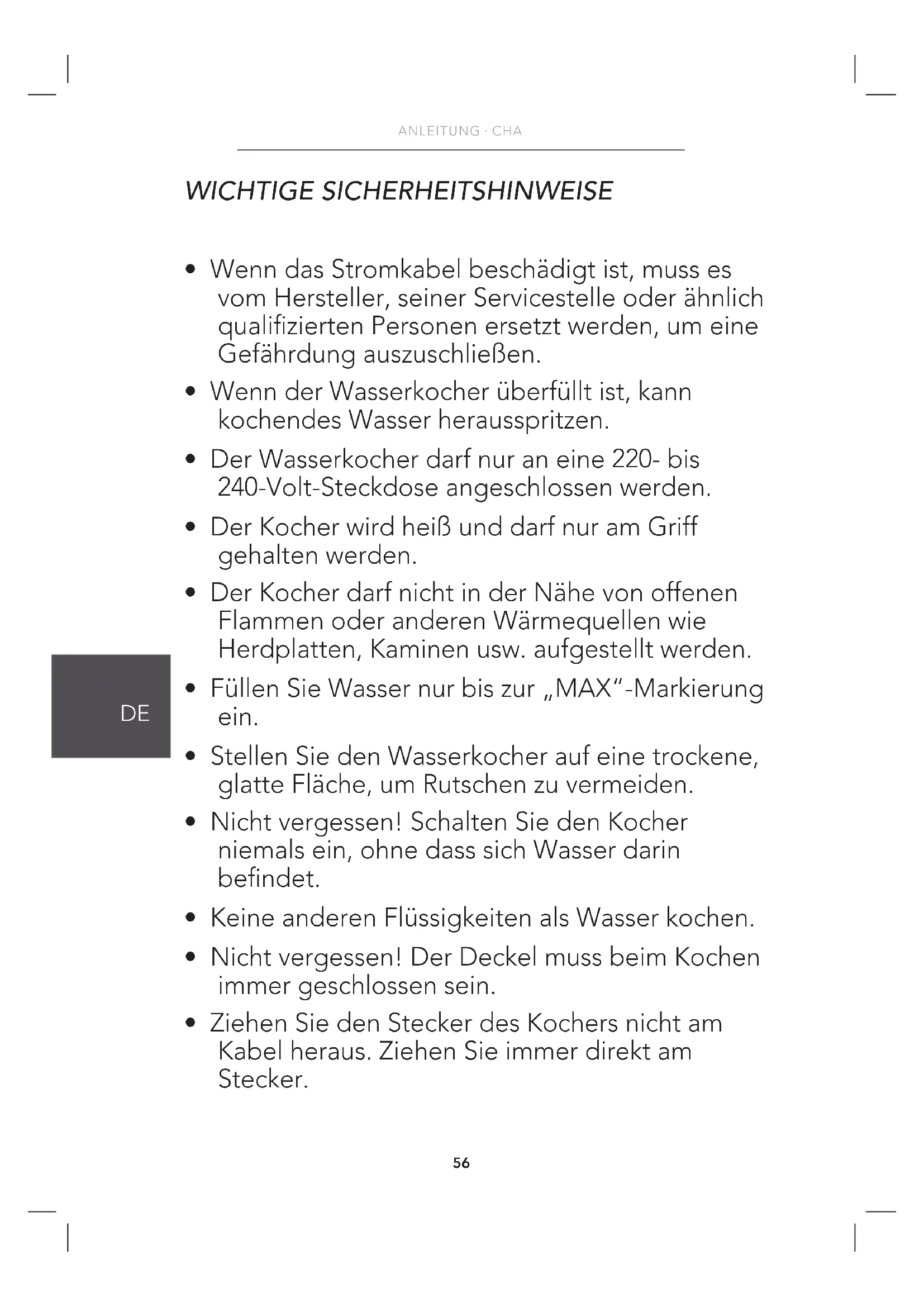 - Ziehen Sie den Stecker des Kochers nicht am Kabel heraus. Ziehen Sie immer direkt am Stecker.57
