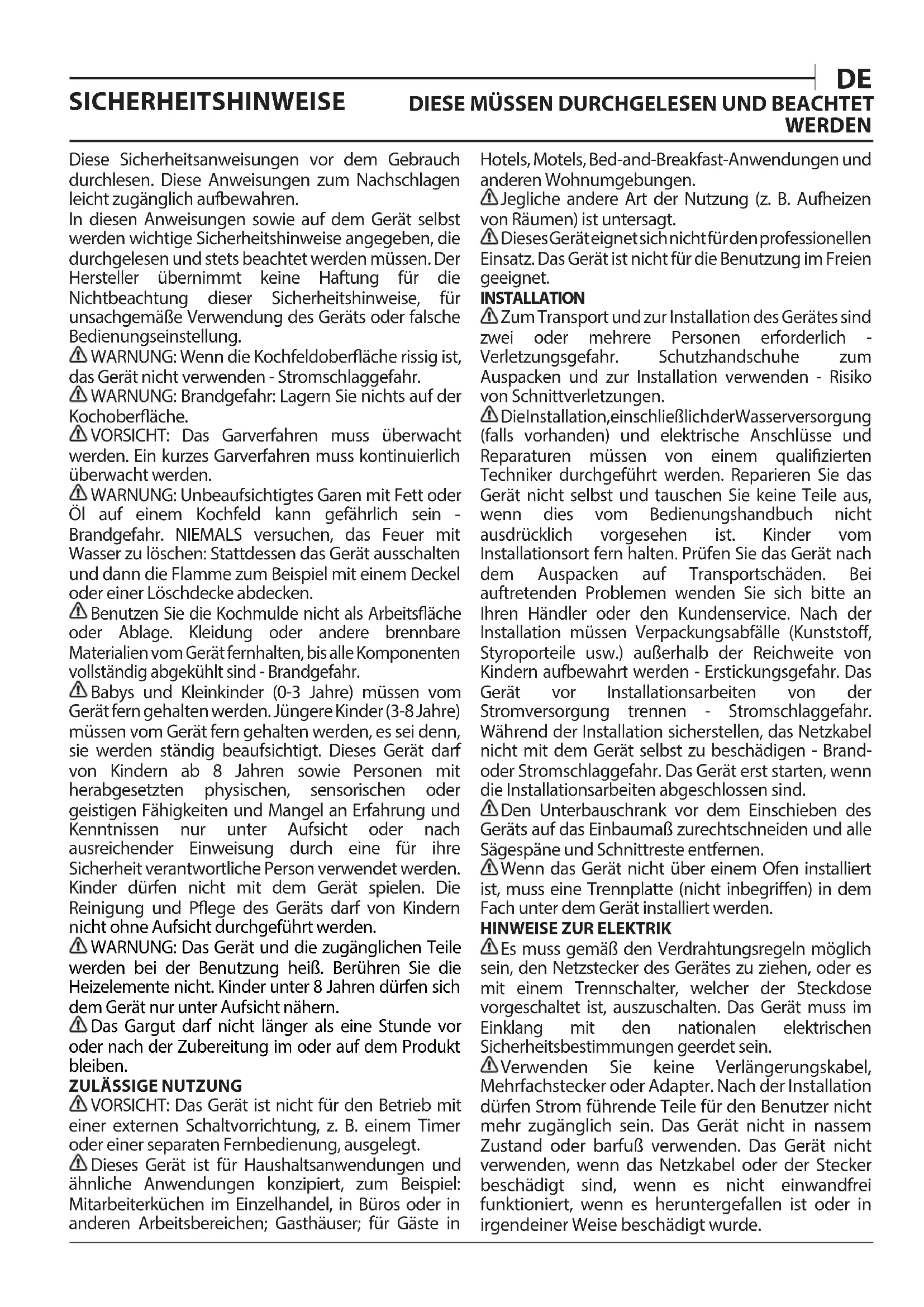 Diese Sicherheitsanweisungen vor dem Gebrauch durchlesen. Diese Anweisungen zum Nachschlagen leicht zugänglich aufbewahren. In diesen Anweisungen sowie auf dem Gerät selbst werden wichtige Sicherheitshinweise angegeben, die durchgelesen und stets beachtet werden müssen. Der Hersteller übernimmt keine Haftung für die Nichtbeachtung dieser Sicherheitshinweise, für unsachgemäße Verwendung des Geräts oder falsche Bedienungseinstellung. WARNUNG: Wenn die Kochfeldoberäche rissig ist, das Gerät nicht verwenden - Stromschlaggefahr. WARNUNG: Brandgefahr: Lagern Sie nichts auf der Kochoberäche. VORSICHT: Das Garverfahren muss überwacht werden. Ein kurzes Garverfahren muss kontinuierlich überwacht werden. WARNUNG: Unbeaufsichtigtes Garen mit Fett oder Öl auf einem Kochfeld kann gefährlich sein - Brandgefahr. NIEMALS versuchen, das Feuer mit Wasser zu löschen: Stattdessen das Gerät ausschalten und dann die Flamme zum Beispiel mit einem Deckel oder einer Löschdecke abdecken. Benutzen Sie die Kochmulde nicht als Arbeitsäche oder Ablage. Kleidung oder andere brennbare Materialien vom Gerät fernhalten, bis alle Komponenten vollständig abgekühlt sind - Brandgefahr. Babys und Kleinkinder (0-3 Jahre) müssen vom Gerät fern gehalten werden. Jüngere Kinder (3-8 Jahre) müssen vom Gerät fern gehalten werden, es sei denn, sie werden ständig beaufsichtigt. Dieses Gerät darf von Kindern ab 8 Jahren sowie Personen mit herabgesetzten physischen, sensorischen oder geistigen Fähigkeiten und Mangel an Erfahrung und Kenntnissen nur unter Aufsicht oder nach ausreichender Einweisung durch eine für ihre Sicherheit verantwortliche Person verwendet werden. Kinder dürfen nicht mit dem Gerät spielen. Die Reinigung und Pege des Geräts darf von Kindern nicht ohne Aufsicht durchgeführt werden. WARNUNG: Das Gerät und die zugänglichen Teile werden bei der Benutzung heiß. Berühren Sie die Heizelemente nicht. Kinder unter 8 Jahren dürfen sich dem Gerät nur unter Aufsicht nähern. Das Gargut darf nicht länger als eine Stunde vor oder nach der Zubereitung im oder auf dem Produkt bleiben.