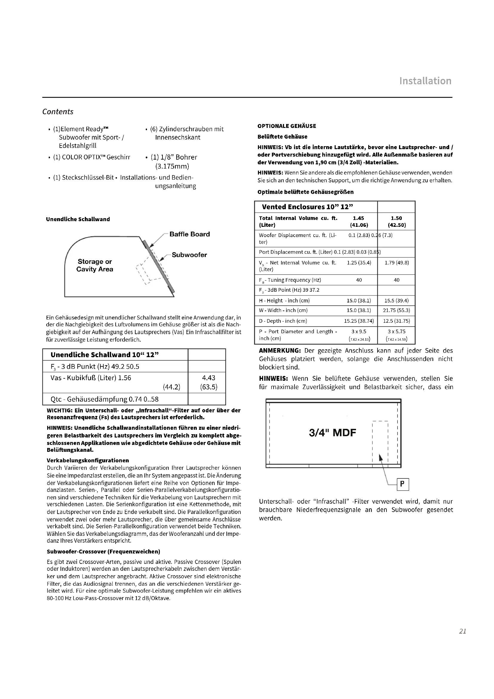 (63.5) Qtc - Gehäusedämpfung 0.74 0..58 WICHTIG: Ein Unterschall- oder „Infraschall“-Filter auf oder über der Resonanzfrequenz (Fs) des Lautsprechers ist erforderlich.HINWEIS: Unendliche Schallwandinstallationen führen zu einer niedri-geren Belastbarkeit des Lautsprechers im Vergleich zu komplett abge-schlossenen Applikationen wie abgedichtete Gehäuse oder Gehäuse mit Belüungskanal.VerkabelungskonfigurationenDurch Variieren der Verkabelungskonfiguration Ihrer Lautsprecher können Sie eine Impedanzlast erstellen, die an Ihr System angepasst ist. Die Änderung der Verkabelungskonfigurationen liefert eine Reihe von Optionen für Impe-danzlasten. Serien-, Parallel oder Serien-Parallelverkabelungskonfiguratio-nen sind verschiedene Techniken für die Verkabelung von Lautsprechern mit verschiedenen Lasten. Die Serienkonfiguration ist eine Kettenmethode, mit der Lautsprecher von Ende zu Ende verkabelt sind. Die Parallelkonfiguration verwendet zwei oder mehr Lautsprecher, die über gemeinsame Anschlüsse verkabelt sind. Die Serien-Parallelkonfiguration verwendet beide Techniken. Wählen Sie das Verkabelungsdiagramm, das der Wooferanzahl und der Impe-danz Ihres Verstärkers entspricht.Subwoofer-Crossover (Frequenzweichen)Es gibt zwei Crossover-Arten, passive und aktive. Passive Crossover (Spulen oder Induktoren) werden an den Lautsprecherkabeln zwischen dem Verstär-ker und dem Lautsprecher angebracht. Aktive Crossover sind elektronische Filter, die das Audiosignal trennen, das an die verschiedenen Verstärker ge-leitet wird. Für eine optimale Subwoofer-Leistung empfehlen wir ein aktives 80-100 Hz Low-Pass-Crossover mit 12 dB/Oktave. Storage or Cavity Area Baffle Board Subwoofer Contents OPTIONALE GEHÄUSEBelüete GehäuseHINWEIS: Vb ist die interne Lautstärke, bevor eine Lautsprecher- und / oder Portverschiebung hinzugefügt wird. Alle Außenmaße basieren auf der Verwendung von 1,90 cm (3/4 Zoll) -Materialien.HINWEIS: Wenn Sie andere als die empfohlenen Gehäuse verwenden, wenden Sie sich an den technischen Support, um die richtige Anwendung zu erhalten.Optimale belüete Gehäusegrößen Vented Enclosures 10” 12” Total Internal Volume cu... (Liter)1.45 (41.06)1.50 (42.50)Woofer Displacement cu... (Li- ter)