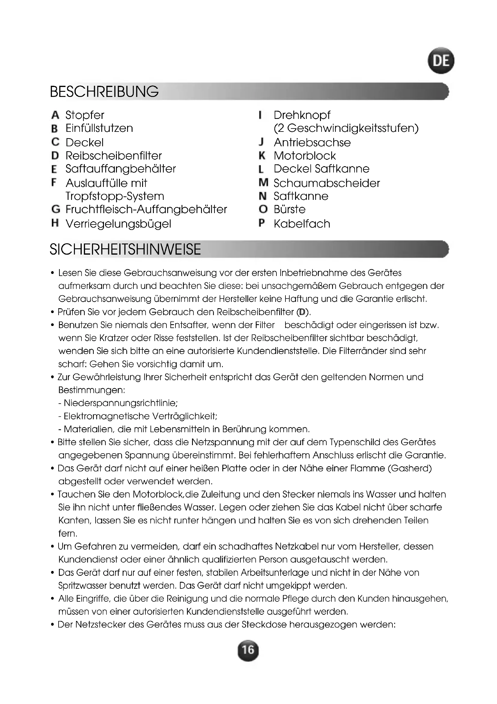 Das Gerät darf nur an eine geerdete Steckdose angeschlossen werden. SICHERHEITSSYSTEM Das Gerät verfügt über ein Sicherheitssystem. Um den Entsafter in Betrieb zu nehmen, muss der Deckel (
