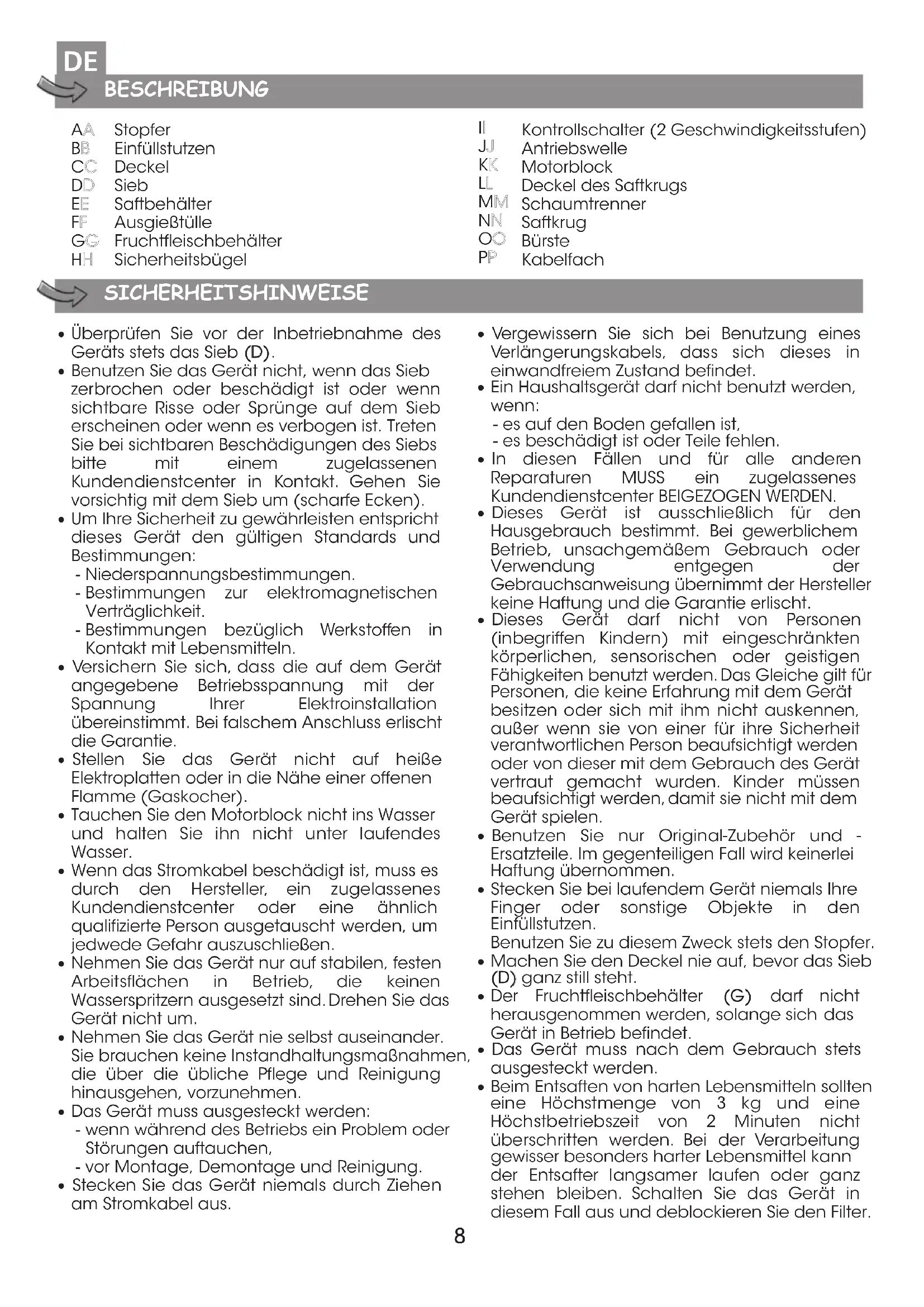 BESCHREIBUNG SICHERHEITSHINWEISE Stopfer Einfüllstutzen Deckel Sieb Saftbehälter Ausgießtülle Fruchtfleischbehälter Sicherheitsbügel Kontrollschalter (2 Geschwindigkeitsstufen) Antriebswelle Motorblock Deckel des Saftkrugs Schaumtrenner Saftkrug Bürste Kabelfach