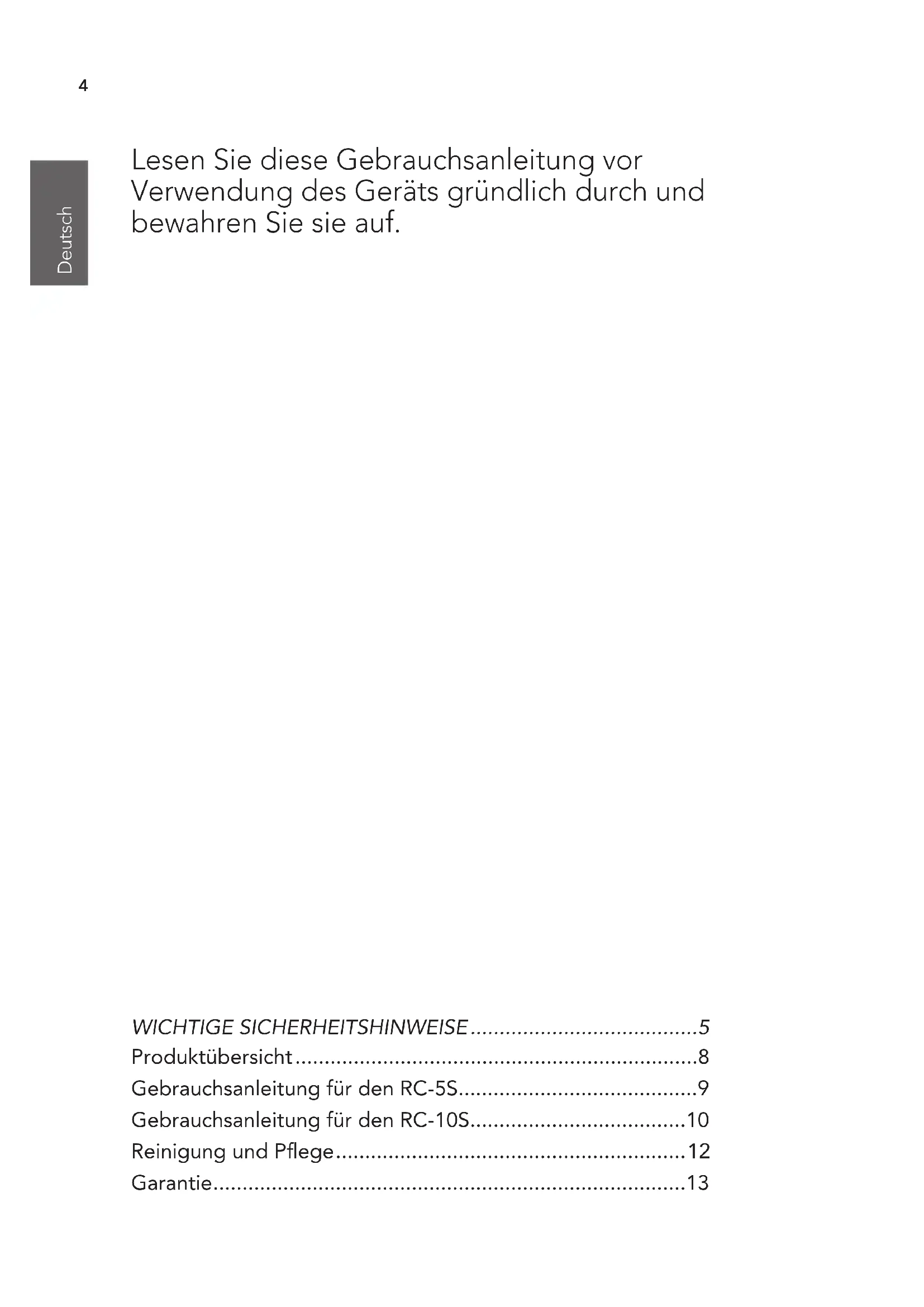 - Garantie Lesen Sie diese Gebrauchsanleitung vor Verwendung des Geräts gründlich durch und bewahren Sie sie auf.5 Deutsch Deutsch Deutsch Deutsch WICHTIGE SICHERHEITSHINWEISE p. 13