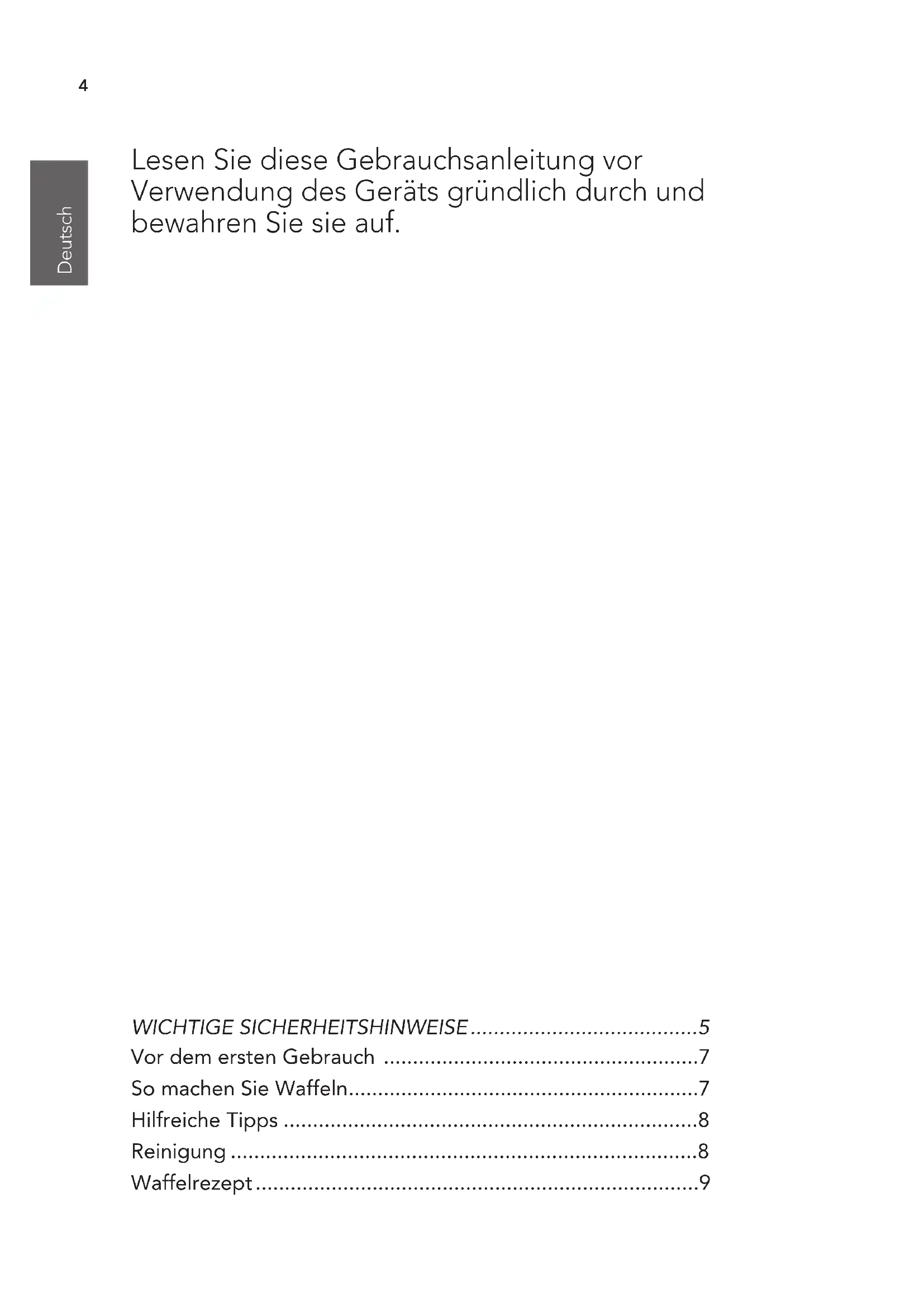 - Waffelrezept Lesen Sie diese Gebrauchsanleitung vor Verwendung des Geräts gründlich durch und bewahren Sie sie auf.5 Deutsch Deutsch Deutsch Deutsch WICHTIGE SICHERHEITSHINWEISE p. 9