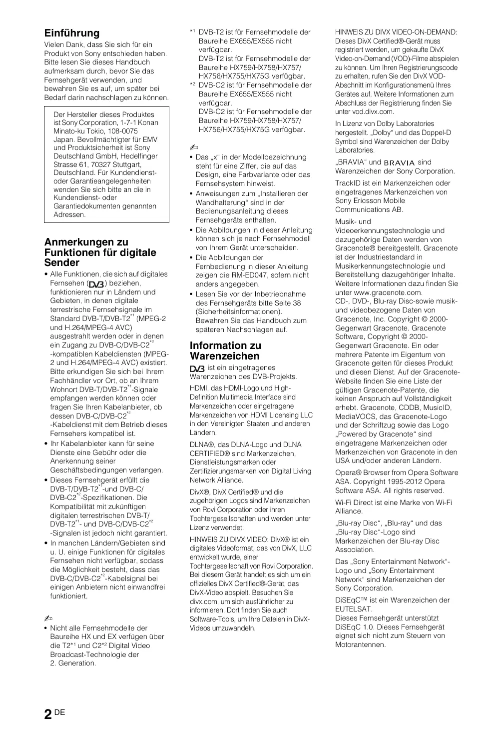 2 DE *¹ DVB-T2 ist für Fernsehmodelle der Baureihe EX655/EX555 nicht verfügbar. DVB-T2 ist für Fernsehmodelle der Baureihe HX759/HX758/HX757/ HX756/HX755/HX75G verfügbar. *² DVB-C2 ist für Fernsehmodelle der Baureihe EX655/EX555 nicht verfügbar. DVB-C2 ist für Fernsehmodelle der Baureihe HX759/HX758/HX757/ HX756/HX755/HX75G verfügbar.