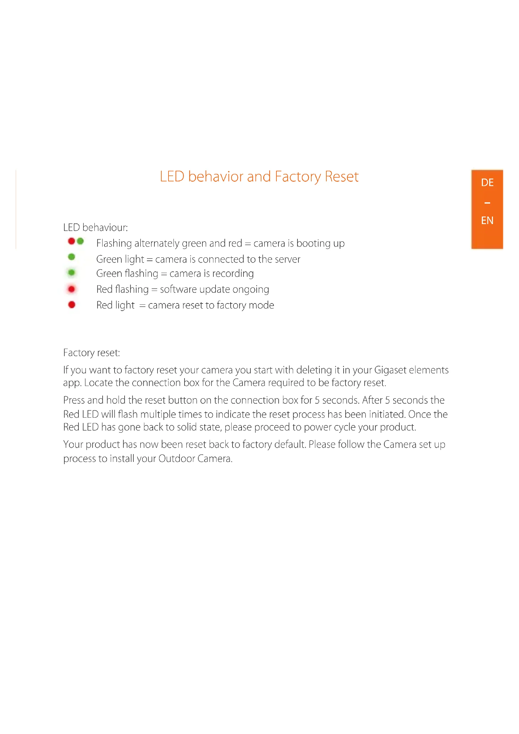 ENLED Verhalten: Blinkt abwechselnd grün und rot = Kamera fährt hoch Grün = Kamera ist mit dem Server verbunden Grün blinkend = Kamera nimmt auf Rot blinkend = Software Update wird durchgeführt Rot = Kamera wird auf Werkseinstellung zurückgesetzt Auf Werkseinstellung zurücksetzen: Wenn Sie die Kamera zurücksetzen möchten, löschen Sie diese bitte zuerst in der Gigaset elements App. Danach begeben Sie sich in die Nähe der Verbindungsbox. Drücken und halten Sie den RESET Knopf für 5 Sekunden. Nach 5 Sekunden fängt die Kamera an, rot zu blinken. Wenn die rote LED nicht mehr blinkt sondern nur noch an ist, ziehen Sie bitte das Netzteil ab für 2 Minuten. Die Kamera is nun zurückgesetzt und kann erneut verbunden werden. LED Verhalten & WerkseinstellungLED behaviour: Flashing alternately green and red = camera is booting up Green light = camera is connected to the server Green ashing = camera is recording Red ashing = software update ongoing Red light = camera reset to factory mode Factory reset: If you want to factory reset your camera you start with deleting it in your Gigaset elements app. Locate the connection box for the Camera required to be factory reset. Press and hold the reset button on the connection box for 5 seconds. After 5 seconds the Red LED will ash multiple times to indicate the reset process has been initiated. Once the Red LED has gone back to solid state, please proceed to power cycle your product. Your product has now been reset back to factory default. Please follow the Camera set up process to install your Outdoor Camera. LED behavior and Factory Reset