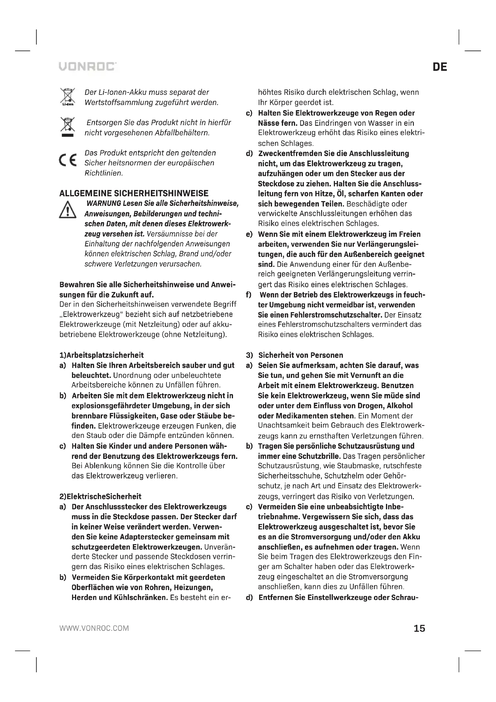 tet wurde. Verwenden Sie keine Lösungsmittel wie Benzin, Alkohol, Ammoniak usw., da Chemikalien dieser Art die Kunststoffteile beschädigen. UMWELTSCHUTZ Schadhafte und/oder zu entsorgende elektrische oder elektronische Werkzeuge und Geräte müssen an den dafür vorgese- henen Recycling-Stellen abgegeben werden. Nur für EG-Länder Entsorgen Sie Elektrowerkzeuge nicht über den Hausmüll. Entsprechend der EU-Richtlinie 2012/19/ EG über Elektro- und Elektronik-Altgeräte sowie der Umsetzung in nationales Recht müssen Elektrowerk- zeuge, die nicht mehr im Gebrauch sind, getrennt gesammelt und umweltschonend entsorgt werden. GARANTIE VONROC-Produkte werden nach den höchsten Qua- li täts stan dards entwickelt und sind für den gesetz- lich festgelegten Zeitraum, ausgehend von dem ur- sprüng lichen Kauf datum, garantiert frei von Fehlern in Material und Aus führ ung. Sollte das Produkt in diesem Zeitraum aufgrund von Material- und/oder Ver ar bei tungs mängeln Fehler aufweisen, wenden Sie sich bitte direkt an VONROC Kundendienst. Folgende Umstände sind von der Garantie ausge- schlossen: