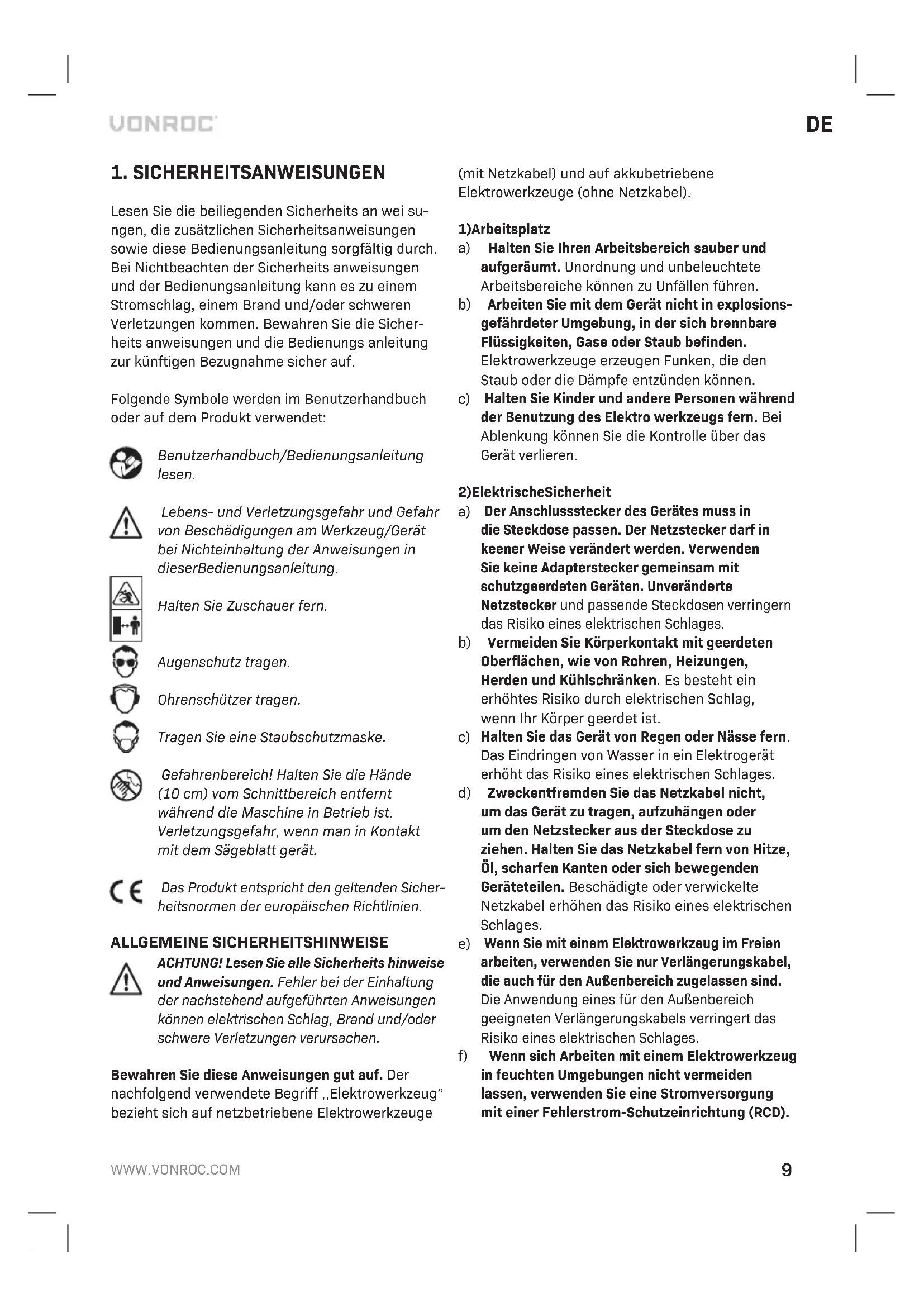 Lesen Sie die beiliegenden Sicherheits an wei su- ngen, die zusätzlichen Sicherheitsanweisungen sowie diese Bedienungsanleitung sorgfältig durch. Bei Nichtbeachten der Sicherheits anweisungen und der Bedienungsanleitung kann es zu einem Stromschlag, einem Brand und/oder schweren Verletzungen kommen. Bewahren Sie die Sicher- heits anweisungen und die Bedienungs anleitung zur künftigen Bezugnahme sicher auf. Folgende Symbole werden im Benutzerhandbuch oder auf dem Produkt verwendet: Benutzerhandbuch/Bedienungsanleitung lesen. Lebens- und Verletzungsgefahr und Gefahr von Beschädigungen am Werkzeug/Gerät bei Nichteinhaltung der Anweisungen in dieser Bedienungs anleitung. Halten Sie Zuschauer fern. Augenschutz tragen. Ohrenschützer tragen. Tragen Sie eine Staubschutzmaske. Gefahrenbereich! Halten Sie die Hände (10 cm) vom Schnittbereich entfernt während die Maschine in Betrieb ist. Verletzungsgefahr, wenn man in Kontakt mit dem Sägeblatt gerät. Das Produkt entspricht den geltenden Sicher- heitsnormen der europäischen Richtlinien. ALLGEMEINE SICHERHEITSHINWEISE ACHTUNG! Lesen Sie alle Sicherheits hinweise und Anweisungen. Fehler bei der Einhaltung der nachstehend aufgeführten Anweisungen können elektrischen Schlag, Brand und/oder schwere Verletzungen verursachen. Bewahren Sie diese Anweisungen gut auf. Der nachfolgend verwendete Begriff ,,Elektrowerkzeug” bezieht sich auf netzbetriebene Elektrowerkzeuge (mit Netzkabel) und auf akkubetriebene Elektrowerkzeuge (ohne Netzkabel).