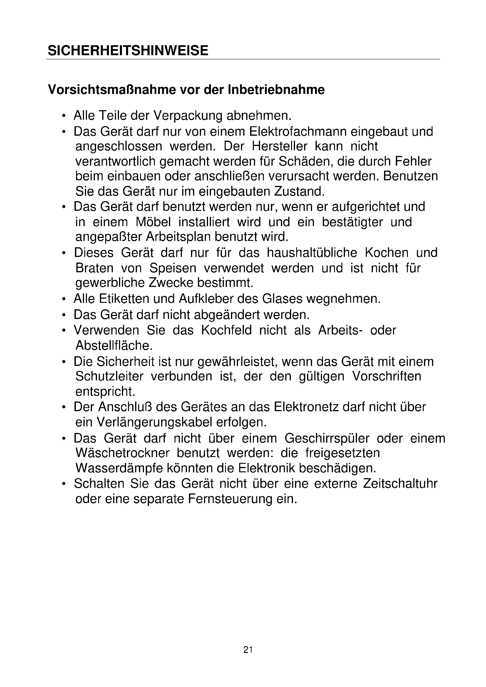 - WARNUNG: Wenn die Glasoberfläche gesprungen ist, ist das Gerät auszuschalten um die Gefahr eines elektrischen Schlages zu vermeiden. Schutz vor weiteren Gefahren