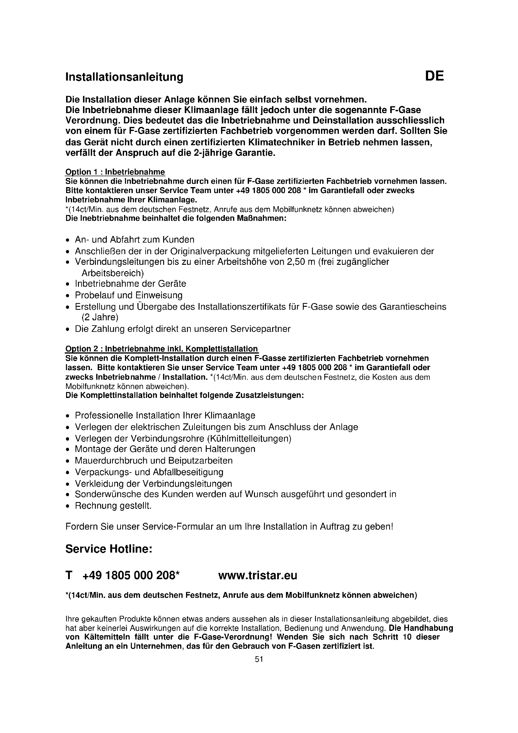 - Rechnung gestellt. Fordern Sie unser Service-Formular an um Ihre Installation in Auftrag zu geben! Service Hotline: T +49 1805 000 208* www.tristar.eu *(14ct/Min. aus dem deutschen Festnetz, Anrufe aus dem Mobilfunknetz können abweichen) Ihre gekauften Produkte können etwas anders aussehen als in dieser Installationsanleitung abgebildet, dies hat aber keinerlei Auswirkungen auf die korrekte Installation, Bedienung und Anwendung. Die Handhabung von Kältemitteln fällt unter die F-Gase-Verordnung! Wenden Sie sich nach Schritt 10 dieser Anleitung an ein Unternehmen, das für den Gebrauch von F-Gasen zertifiziert ist.52