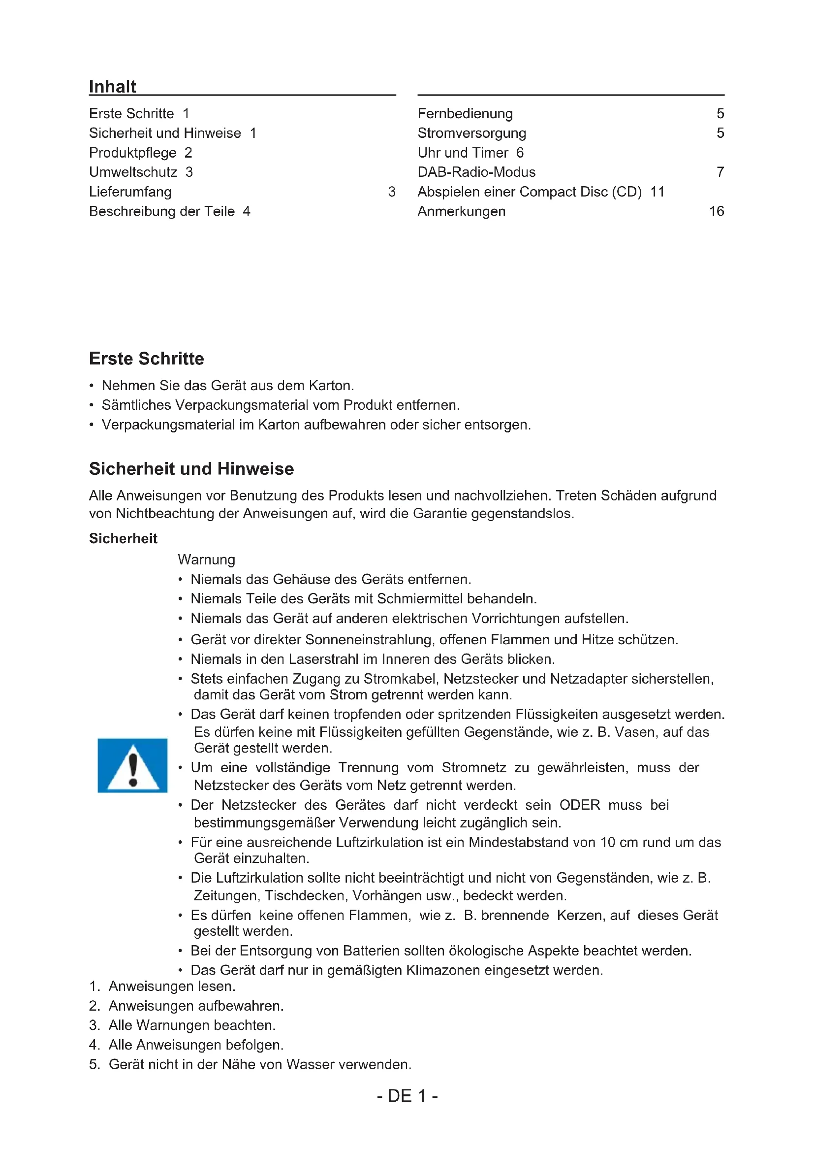 Erste Schritte 1 Sicherheit und Hinweise 1 Produktpege 2 Umweltschutz 3 Lieferumfang 3 Beschreibung der Teile 4 Fernbedienung 5 Stromversorgung 5 Uhr und Timer 6 DAB-Radio-Modus 7 Abspielen einer Compact Disc (CD) 11 Anmerkungen: 16 Inhalt- DE 2 -