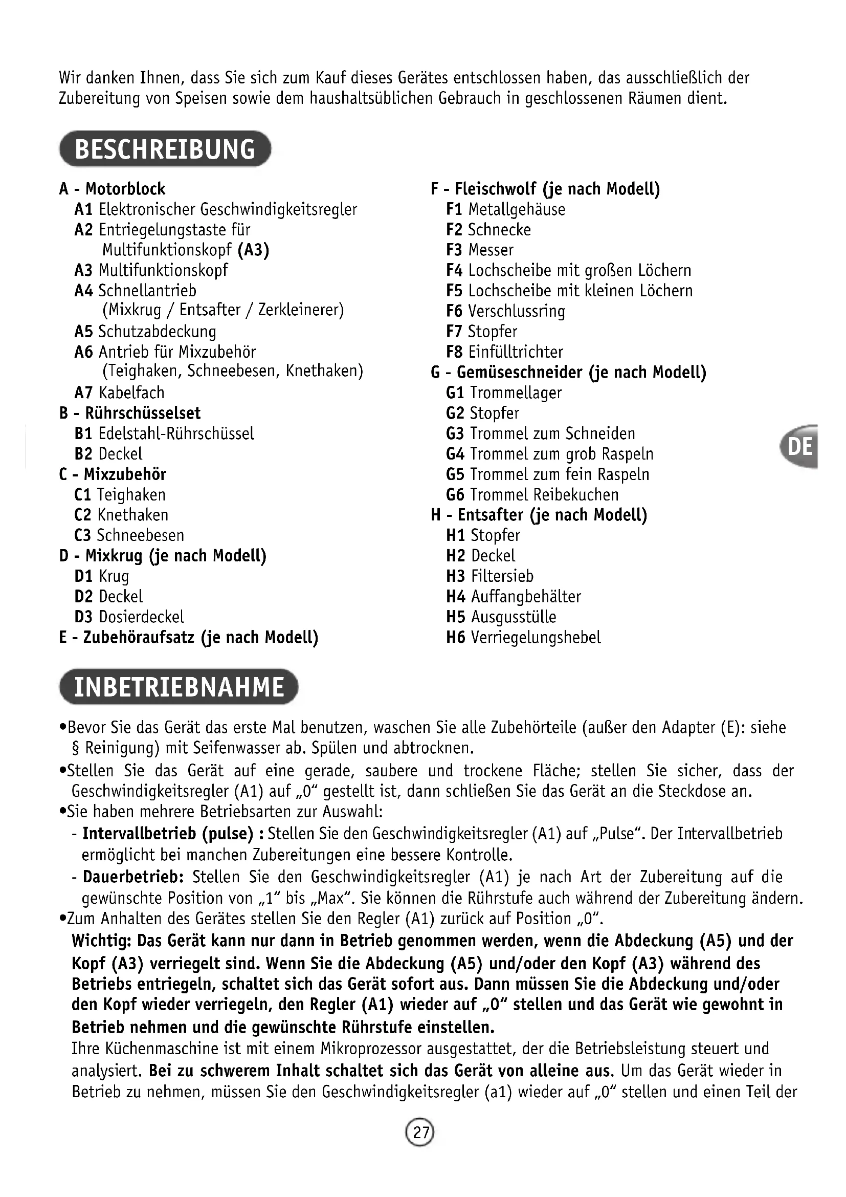 MASTERCHEF-GOURM-8080013820 07/07/14 14:00 Page2627 BESCHREIBUNG A - Motorblock A1 Elektronischer Geschwindigkeitsregler A2 Entriegelungstaste für Multifunktionskopf (A3) A3 Multifunktionskopf A4 Schnellantrieb (Mixkrug / Entsafter / Zerkleinerer) A5 Schutzabdeckung A6 Antrieb für Mixzubehör (Teighaken, Schneebesen, Knethaken) A7 Kabelfach B - Rührschüsselset B1 Edelstahl-Rührschüssel B2 Deckel C - Mixzubehör C1 Teighaken C2 Knethaken C3 Schneebesen D - Mixkrug (je nach Modell) D1 Krug D2 Deckel D3 Dosierdeckel E - Zubehöraufsatz (je nach Modell) F - Fleischwolf (je nach Modell) F1 Metallgehäuse F2 Schnecke F3 Messer F4 Lochscheibe mit großen Löchern F5 Lochscheibe mit kleinen Löchern F6 Verschlussring F7 Stopfer F8 Einfülltrichter G - Gemüseschneider (je nach Modell) G1 Trommellager G2 Stopfer G3 Trommel zum Schneiden G4 Trommel zum grob Raspeln G5 Trommel zum fein Raspeln G6 Trommel Reibekuchen H - Entsafter (je nach Modell) H1 Stopfer H2 Deckel H3 Filtersieb H4 Auffangbehälter H5 Ausgusstülle H6 Verriegelungshebel INBETRIEBNAHME