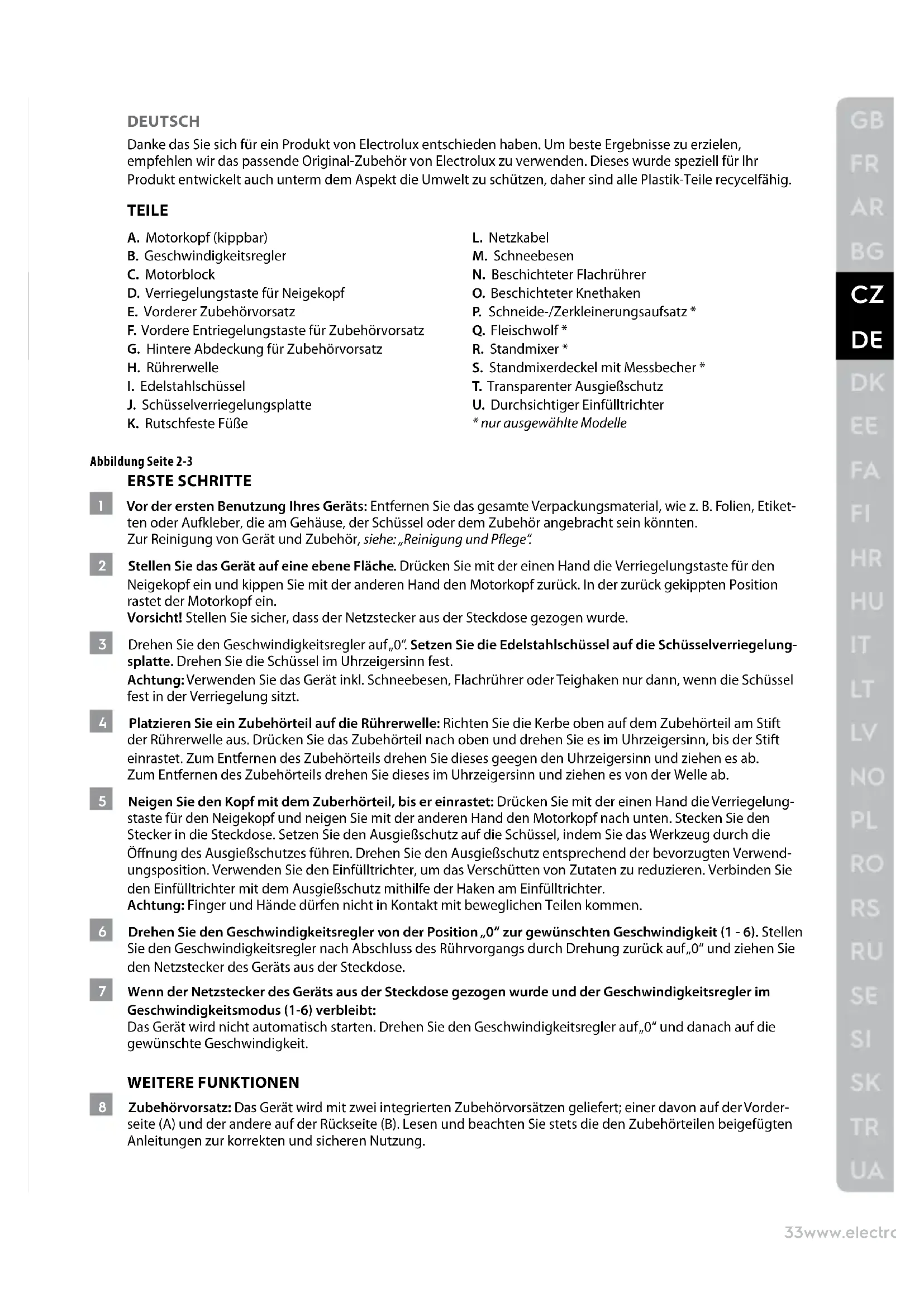 - nur ausgewählte Modelle Abbildung Seite 2-3 ERSTE SCHRITTE 1 Vor der ersten Benutzung Ihres Geräts: Entfernen Sie das gesamte Verpackungsmaterial, wie z. B. Folien, Etiket- ten oder Aufkleber, die am Gehäuse, der Schüssel oder dem Zubehör angebracht sein könnten. Zur Reinigung von Gerät und Zubehör, siehe: „Reinigung und Pege“. 2 Stellen Sie das Gerät auf eine ebene Fläche. Drücken Sie mit der einen Hand die Verriegelungstaste für den Neigekopf ein und kippen Sie mit der anderen Hand den Motorkopf zurück. In der zurück gekippten Position rastet der Motorkopf ein. Vorsicht! Stellen Sie sicher, dass der Netzstecker aus der Steckdose gezogen wurde. 3 Drehen Sie den Geschwindigkeitsregler auf „0“. Setzen Sie die Edelstahlschüssel auf die Schüsselverriegelung- splatte. Drehen Sie die Schüssel im Uhrzeigersinn fest. Achtung: Verwenden Sie das Gerät inkl. Schneebesen, Flachrührer oder Teighaken nur dann, wenn die Schüssel fest in der Verriegelung sitzt. 4 Platzieren Sie ein Zubehörteil auf die Rührerwelle: Richten Sie die Kerbe oben auf dem Zubehörteil am Stift der Rührerwelle aus. Drücken Sie das Zubehörteil nach oben und drehen Sie es im Uhrzeigersinn, bis der Stift einrastet. Zum Entfernen des Zubehörteils drehen Sie dieses geegen den Uhrzeigersinn und ziehen es ab. Zum Entfernen des Zubehörteils drehen Sie dieses im Uhrzeigersinn und ziehen es von der Welle ab. 5 Neigen Sie den Kopf mit dem Zuberhörteil, bis er einrastet: Drücken Sie mit der einen Hand die Verriegelung- staste für den Neigekopf und neigen Sie mit der anderen Hand den Motorkopf nach unten. Stecken Sie den Stecker in die Steckdose. Setzen Sie den Ausgießschutz auf die Schüssel, indem Sie das Werkzeug durch die Önung des Ausgießschutzes führen. Drehen Sie den Ausgießschutz entsprechend der bevorzugten Verwend- ungsposition. Verwenden Sie den Einfülltrichter, um das Verschütten von Zutaten zu reduzieren. Verbinden Sie den Einfülltrichter mit dem Ausgießschutz mithilfe der Haken am Einfülltrichter. Achtung: Finger und Hände dürfen nicht in Kontakt mit beweglichen Teilen kommen. 6 Drehen Sie den Geschwindigkeitsregler von der Position „0“ zur gewünschten Geschwindigkeit (1 - 6). Stellen Sie den Geschwindigkeitsregler nach Abschluss des Rührvorgangs durch Drehung zurück auf „0“ und ziehen Sie den Netzstecker des Geräts aus der Steckdose. 7 Wenn der Netzstecker des Geräts aus der Steckdose gezogen wurde und der Geschwindigkeitsregler im Geschwindigkeitsmodus (1-6) verbleibt: Das Gerät wird nicht automatisch starten. Drehen Sie den Geschwindigkeitsregler auf „0“ und danach auf die gewünschte Geschwindigkeit. WEITERE FUNKTIONEN 8 Zubehörvorsatz: Das Gerät wird mit zwei integrierten Zubehörvorsätzen geliefert; einer davon auf der Vorder- seite (A) und der andere auf der Rückseite (B). Lesen und beachten Sie stets die den Zubehörteilen beigefügten Anleitungen zur korrekten und sicheren Nutzung.34 www.electrolux.com