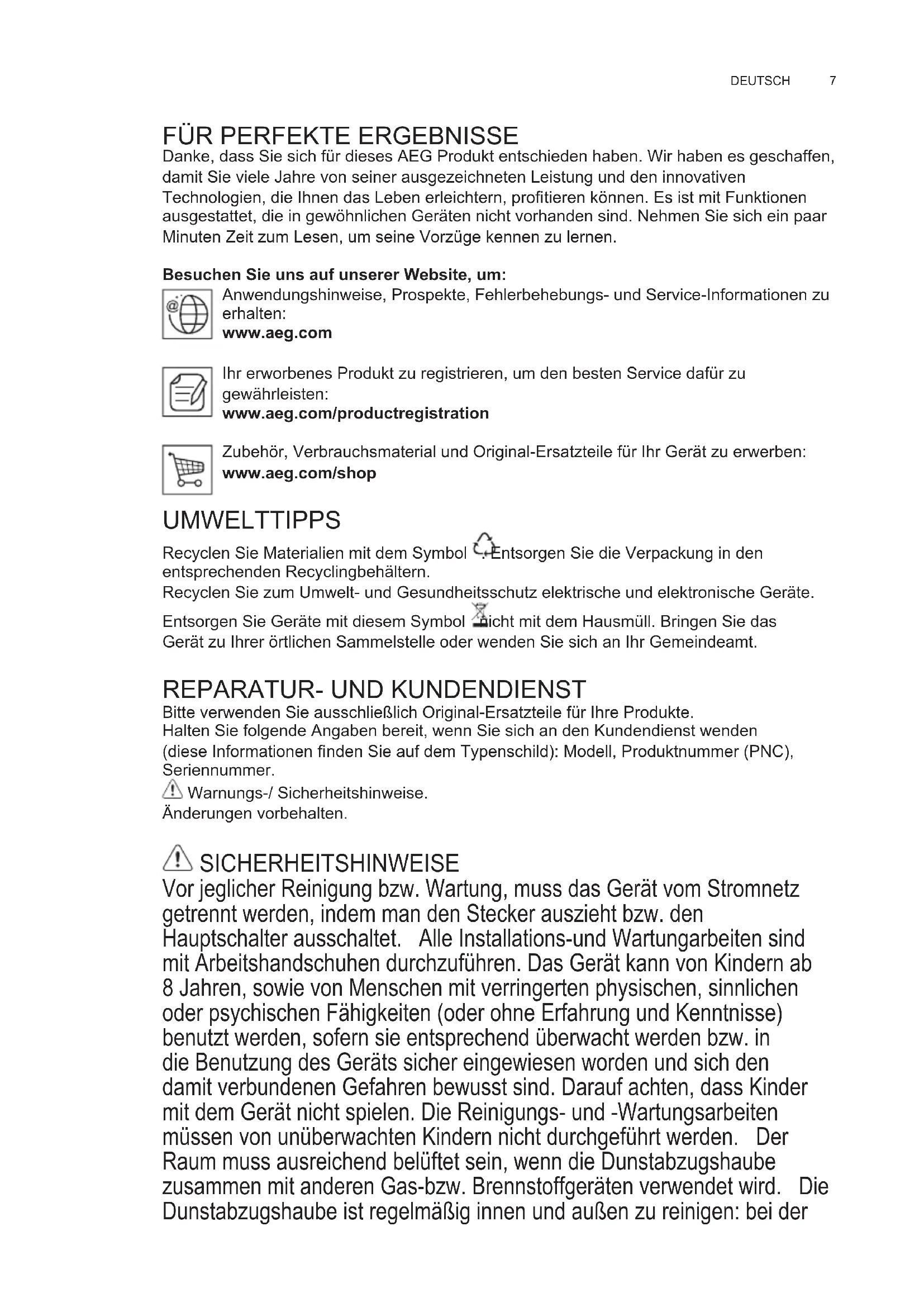 Bitte verwenden Sie ausschließlich Original-Ersatzteile für Ihre Produkte. Halten Sie folgende Angaben bereit, wenn Sie sich an den Kundendienst wenden (diese Informationen fi nden Sie auf dem Typenschild): Modell, Produktnummer (PNC), Seriennummer. Warnungs-/ Sicherheitshinweise. Änderungen vorbehalten. SICHERHEITSHINWEISE Vor jeglicher Reinigung bzw. Wartung, muss das Gerät vom Stromnetz getrennt werden, indem man den Stecker auszieht bzw. den Hauptschalter ausschaltet. Alle Installations-und Wartungarbeiten sind mit Arbeitshandschuhen durchzuführen. Das Gerät kann von Kindern ab 8 Jahren, sowie von Menschen mit verringerten physischen, sinnlichen oder psychischen Fähigkeiten (oder ohne Erfahrung und Kenntnisse) benutzt werden, sofern sie entsprechend überwacht werden bzw. in die Benutzung des Geräts sicher eingewiesen worden und sich den damit verbundenen Gefahren bewusst sind. Darauf achten, dass Kinder mit dem Gerät nicht spielen. Die Reinigungs- und -Wartungsarbeiten müssen von unüberwachten Kindern nicht durchgeführt werden. Der Raum muss ausreichend belüftet sein, wenn die Dunstabzugshaube zusammen mit anderen Gas-bzw. Brennstoffgeräten verwendet wird. Die Dunstabzugshaube ist regelmäßig innen und außen zu reinigen: bei der DE GEBRAUCHSANLEITUNGwww.aeg.com
