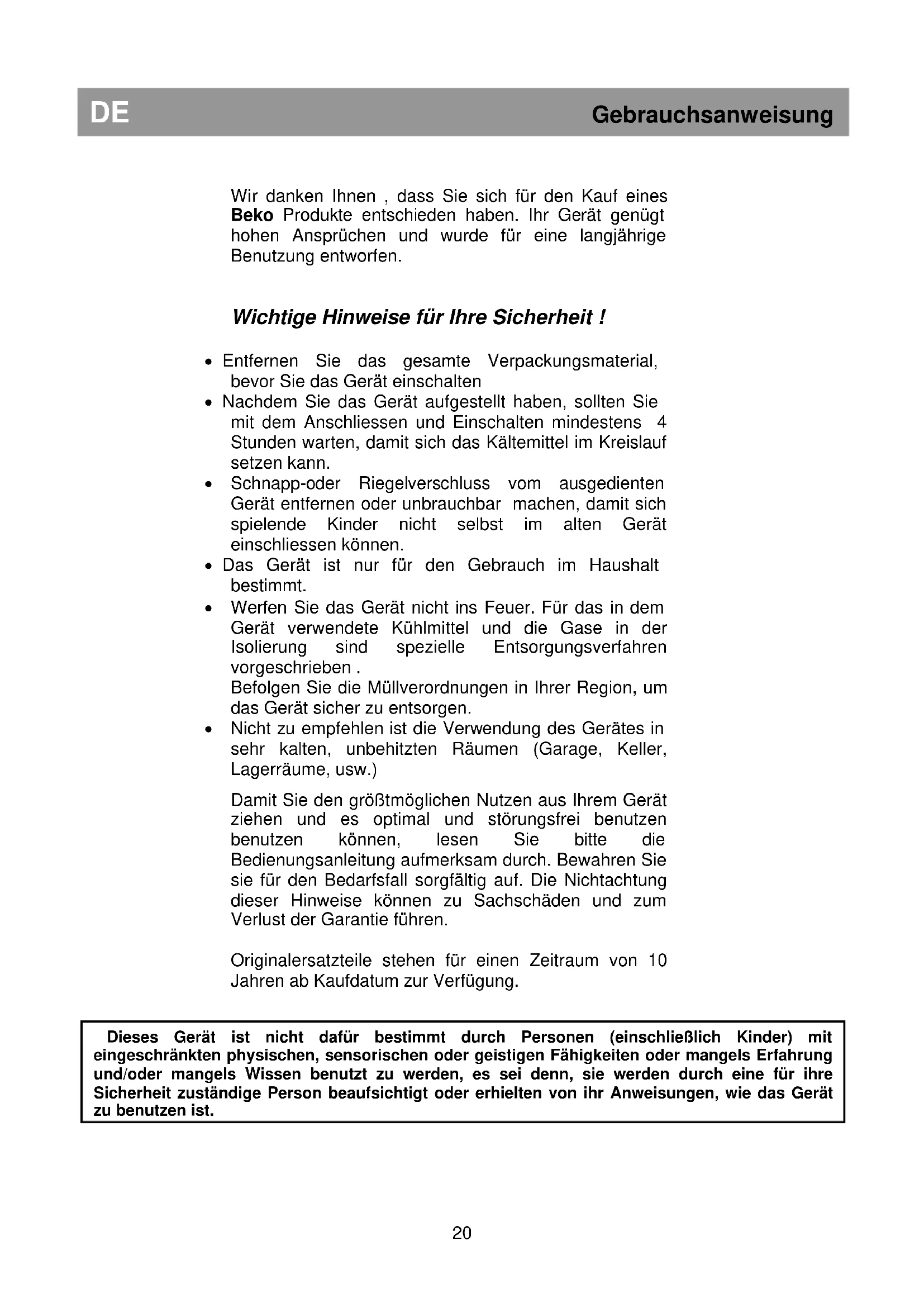 DE GebrauchsanweisungDE Gebrauchsanweisung Elektrischer Anschluss Bevor Sie das Gerät anschliessen, prüfen Sie unbedingt, ob die auf dem Typenschild angegebene Wechselspannung mit der Netzspannung übereinstimmt. Die elektrischen Anschlüsse müssen den gesetzlichen Vorschriften entsprechen. Schließen Sie das Gerät an eine leicht zugängliche Steckdose an. Warnung ! Dieses Gerät muss richtig geerdet werden. Reparatur- und Wa rtungsarbeiten sollten nur von Fachkräften durchgeführt werden. Reparaturen, die von nicht qualifizierten Personen ausgeführt werden, sind eine Gefahrenquelle und können gefährliche Konsequenzen für den Benutzer des Gerätes haben. Achtung! Dieses Gerät verwendet das Kühlmittel R600a, ein Gas mit hoher Umweltverträglichkeit, das aber brennbar ist. Achten Sie beim Transportieren und Aufstellen des Geräts darauf, daß keine Teile des Kühlmittelkreislaufs beschädigt werden. Vermeiden Sie bei Beschädigungen offenes Feuer oder Zündquellen, und lüften Sie den Raum, in dem sich das Gerät befindet, mehrere Minuten lang. Warnung ! Verwenden Sie zur Beschleunigung des Abtauprozesses keine mechanischen oder anderen Hilfsmittel als die vom Hersteller empfohlenen Mittel. Warnung ! Achten Sie darauf, dass der Kühlmittelkreislauf nicht beschädigt wird. Warnung ! Keine elektrische Geräte benutzen um den Abtauprozess zu beschleunigen. Verwenden Sie in der Kühl-Gefrier - Kombination keine anderen als die vom Hersteller empfohlenen elektrischen Geräte. Warnung ! Wenn die Netzanschlussleitung dieses Gerätes beschädigt wird, muss sie durch den Hersteller oder seinen Kundendienst oder eine ähnlich qualifizierte Person ersetzt werden, um Gefährdungen zu vermeiden. Transporthinweise