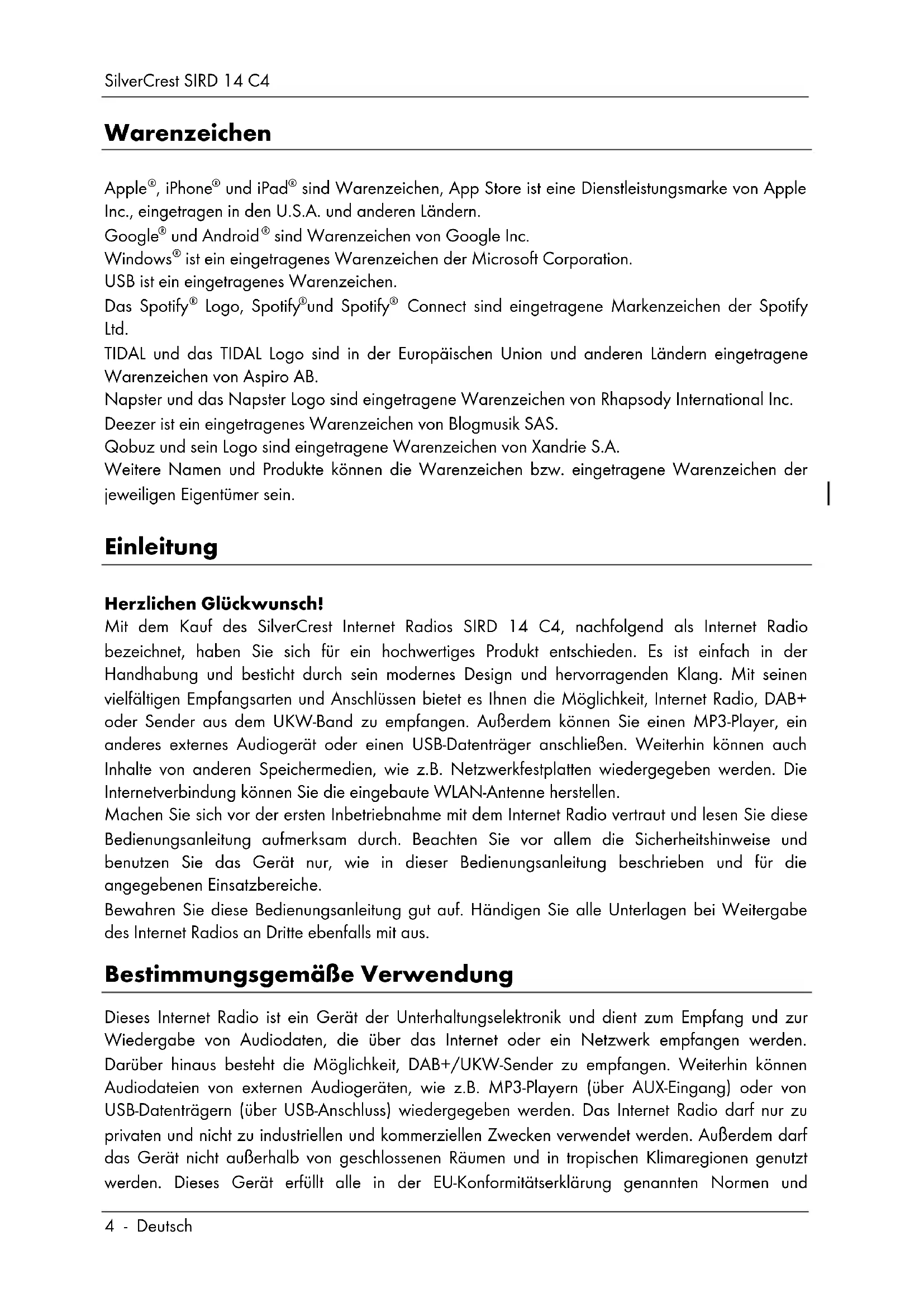 Connect sind eingetragene Markenzeichen der Spotify Ltd. TIDAL und das TIDAL Logo sind in der Europäischen Union und anderen Ländern eingetragene Warenzeichen von Aspiro AB. Napster und das Napster Logo sind eingetragene Warenzeichen von Rhapsody International Inc. Deezer ist ein eingetragenes Warenzeichen von Blogmusik SAS. Qobuz und sein Logo sind eingetragene Warenzeichen von Xandrie S.A. Weitere Namen und Produkte können die Warenzeichen bzw. eingetragene Warenzeichen der jeweiligen Eigentümer sein. Einleitung Herzlichen Glückwunsch! Mit dem Kauf des SilverCrest Internet Radios SIRD 14 C4, nachfolgend als Internet Radio bezeichnet, haben Sie sich für ein hochwertiges Produkt entschieden. Es ist einfach in der Handhabung und besticht durch sein modernes Design und hervorragenden Klang. Mit seinen vielfältigen Empfangsarten und Anschlüssen bietet es Ihnen die Möglichkeit, Internet Radio, DAB+ oder Sender aus dem UKW-Band zu empfangen. Außerdem können Sie einen MP3-Player, ein anderes externes Audiogerät oder einen USB-Datenträger anschließen. Weiterhin können auch Inhalte von anderen Speichermedien, wie z.B. Netzwerkfestplatten wiedergegeben werden. Die Internetverbindung können Sie die eingebaute WLAN-Antenne herstellen. Machen Sie sich vor der ersten Inbetriebnahme mit dem Internet Radio vertraut und lesen Sie diese Bedienungsanleitung aufmerksam durch. Beachten Sie vor allem die Sicherheitshinweise und benutzen Sie das Gerät nur, wie in dieser Bedienungsanleitung beschrieben und für die angegebenen Einsatzbereiche. Bewahren Sie diese Bedienungsanleitung gut auf. Händigen Sie alle Unterlagen bei Weitergabe des Internet Radios an Dritte ebenfalls mit aus. Bestimmungsgemäße Verwendung Dieses Internet Radio ist ein Gerät der Unterhaltungselektronik und dient zum Empfang und zur Wiedergabe von Audiodaten, die über das Internet oder ein Netzwerk empfangen werden. Darüber hinaus besteht die Möglichkeit, DAB+/UKW-Sender zu empfangen. Weiterhin können Audiodateien von externen Audiogeräten, wie z.B. MP3-Playern (über AUX-Eingang) oder von USB-Datenträgern (über USB-Anschluss) wiedergegeben werden. Das Internet Radio darf nur zu privaten und nicht zu industriellen und kommerziellen Zwecken verwendet werden. Außerdem darf das Gerät nicht außerhalb von geschlossenen Räumen und in tropischen Klimaregionen genutzt werden. Dieses Gerät erfüllt alle in der EU-Konformitätserklärung genannten Normen undSilverCrest SIRD 14 C4 Deutsch - 5 Richtlinien. Bei eigenmächtigen Umbauten des Gerätes und hieraus resultierenden Schäden oder Störungen ist jegliche Haftung seitens des Herstellers ausgeschlossen. Benutzen Sie nur das vom Hersteller angegebene Zubehör. Bitte beachten Sie die Landesvorschriften bzw. Gesetze des Einsatzlandes. Beachten Sie, dass in verschiedenen Ländern abweichende nationale Regelungen bestehen können, welche Frequenzbereiche frei empfangen werden dürfen. Außerhalb der zugestandenen Frequenzbereiche empfangene Informationen dürfen weder verwertet, noch deren Inhalt oder die Tatsache des Empfangs an Dritte weitergegeben werden. Lieferumfang Nehmen Sie das Gerät und alle Zubehörteile aus der Verpackung. Entfernen Sie alle Verpackungsmaterialien und überprüfen Sie, ob alle Teile vollständig und unbeschädigt sind. Im Falle einer unvollständigen oder beschädigten Lieferung wenden Sie sich bitte an den Hersteller. A Internet Radio SilverCrest SIRD 14 C4 B Fernbedienung C 2 Batterien 1,5V, AAA/LR03 D 3,5mm Audio-Klinkenkabel E Netzteil F Diese Bedienungsanleitung (Symbolbild)SilverCrest SIRD 14 C4