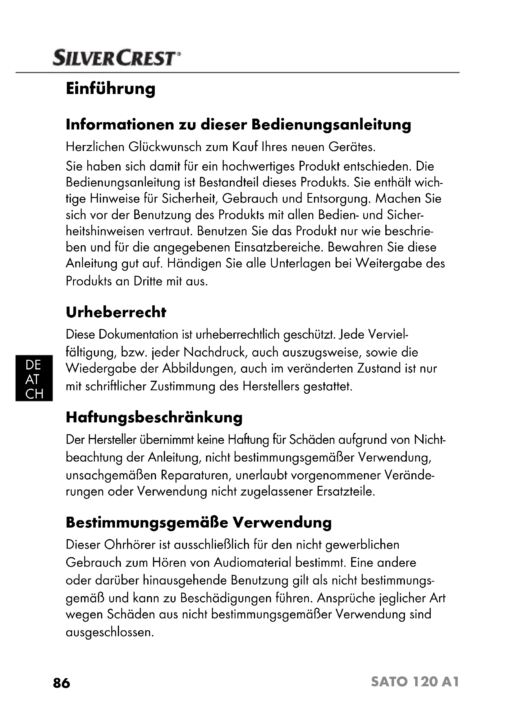 SATO 120 A1 Einführung Informationen zu dieser Bedienungsanleitung Herzlichen Glückwunsch zum Kauf Ihres neuen Gerätes. Sie haben sich damit für ein hochwertiges Produkt entschieden. Die Bedienungsanleitung ist Bestandteil dieses Produkts. Sie enthält wich- tige Hinweise für Sicherheit, Gebrauch und Entsorgung. Machen Sie sich vor der Benutzung des Produkts mit allen Bedien- und Sicher- heitshinweisen vertraut. Benutzen Sie das Produkt nur wie beschrie- ben und für die angegebenen Einsatzbereiche. Bewahren Sie diese Anleitung gut auf. Händigen Sie alle Unterlagen bei Weitergabe des Produkts an Dritte mit aus. Urheberrecht Diese Dokumentation ist urheberrechtlich geschützt. Jede Verviel- fältigung, bzw. jeder Nachdruck, auch auszugsweise, sowie die Wiedergabe der Abbildungen, auch im veränderten Zustand ist nur mit schriftlicher Zustimmung des Herstellers gestattet. Haftungsbeschränkung Der Hersteller übernimmt keine Haftung für Schäden aufgrund von Nicht- beachtung der Anleitung, nicht bestimmungsgemäßer Verwendung, unsachgemäßen Reparaturen, unerlaubt vorgenommener Verände- rungen oder Verwendung nicht zugelassener Ersatzteile. Bestimmungsgemäße Verwendung Dieser Ohrhörer ist ausschließlich für den nicht gewerblichen Gebrauch zum Hören von Audiomaterial bestimmt. Eine andere oder darüber hinausgehende Benutzung gilt als nicht bestimmungs- gemäß und kann zu Beschädigungen führen. Ansprüche jeglicher Art wegen Schäden aus nicht bestimmungsgemäßer Verwendung sind ausgeschlossen. IB_42782_SATO120A1_LB3.indb 86IB_42782_SATO120A1_LB3.indb 86 09.10.13 11:1709.10.13 11:1787 SATO 120 A1