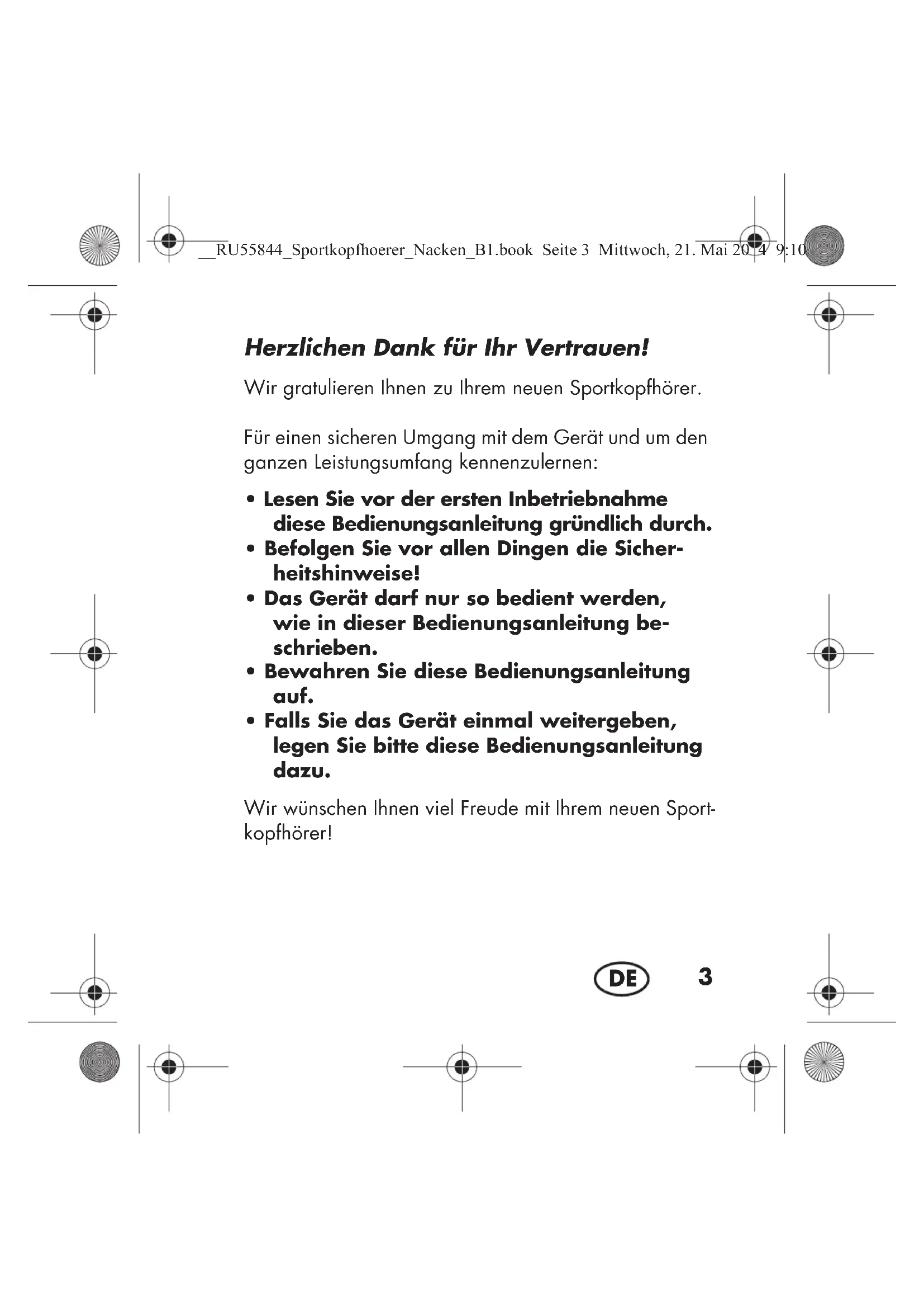 - Falls Sie das Gerät einmal weitergeben, legen Sie bitte diese Bedienungsanleitung dazu. Wir wünschen Ihnen viel Freude mit Ihrem neuen Sport- kopfhörer! __RU55844_Sportkopfhoerer_Nacken_B1.book Seite 3 Mittwoch, 21. Mai 2014 9:10 094